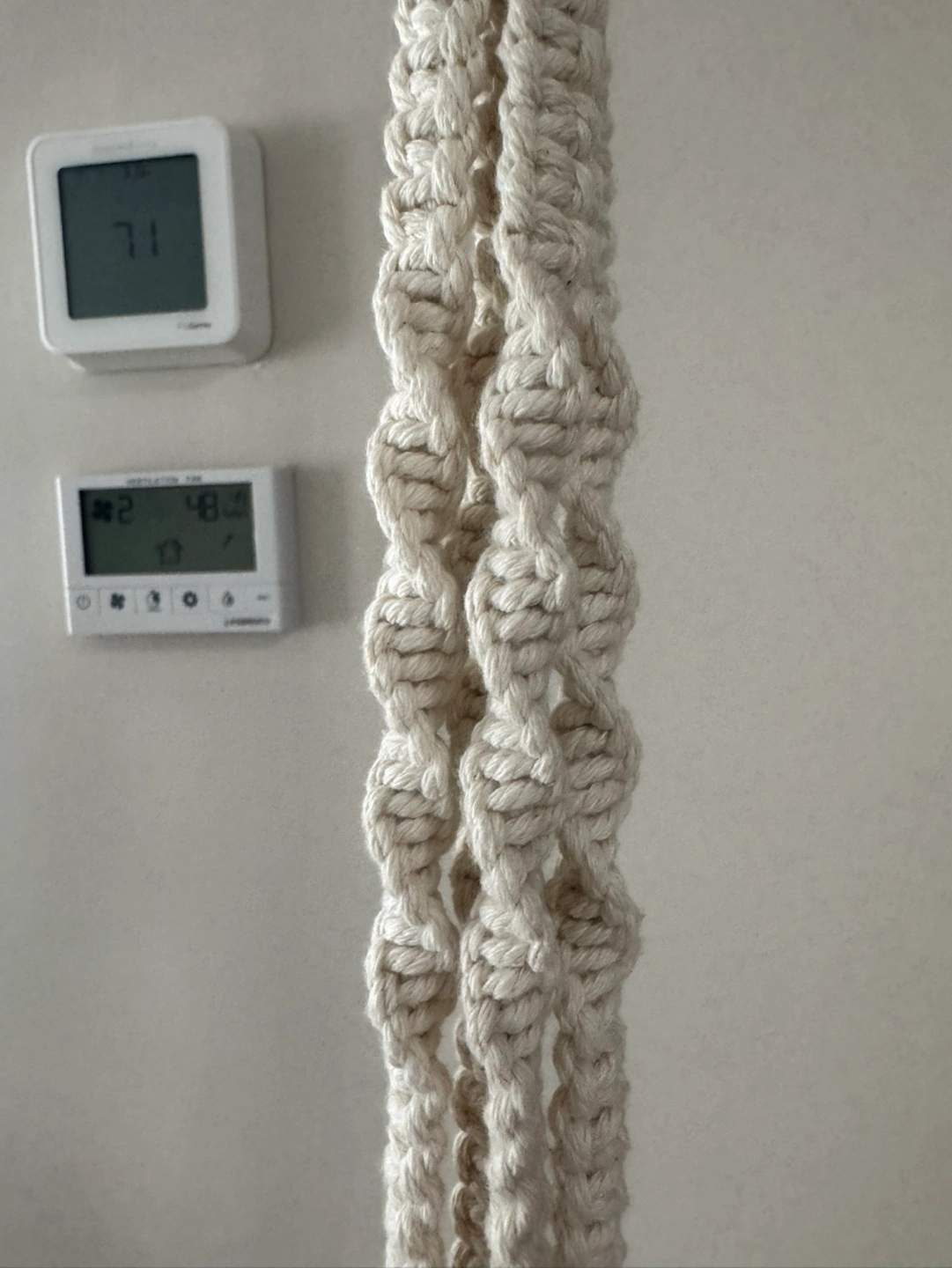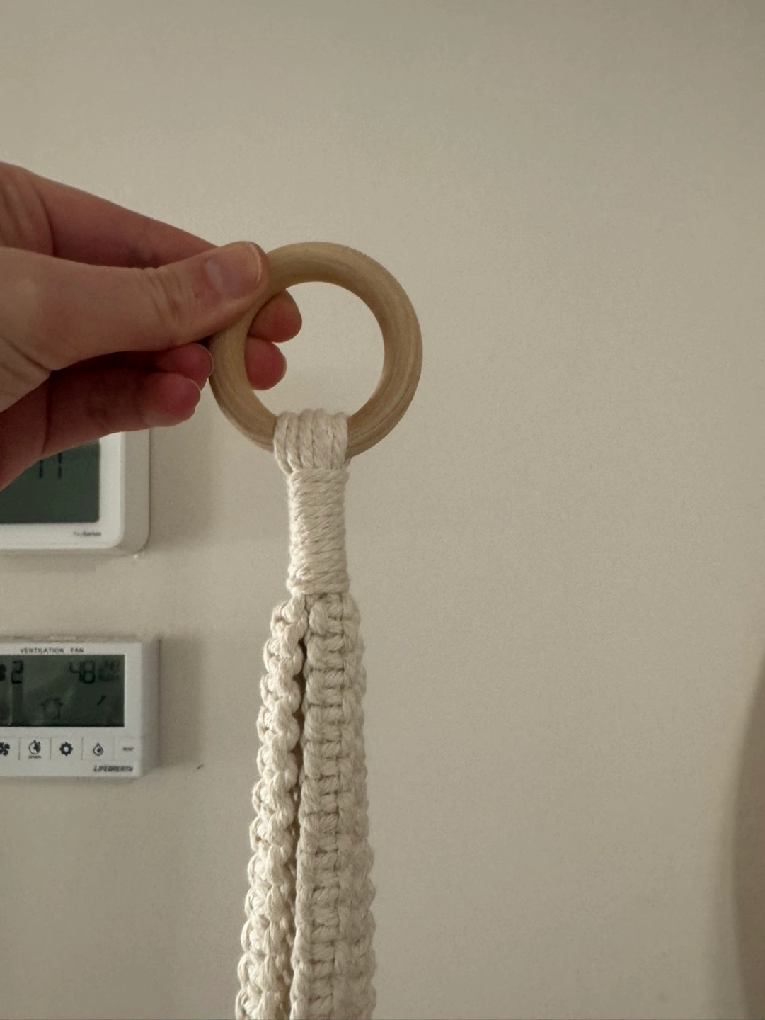 Handmade macrame plant hanger. Off-white cotton cord. Wooden ring top. Perfect for small plants.