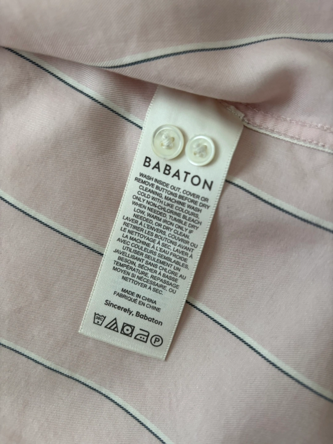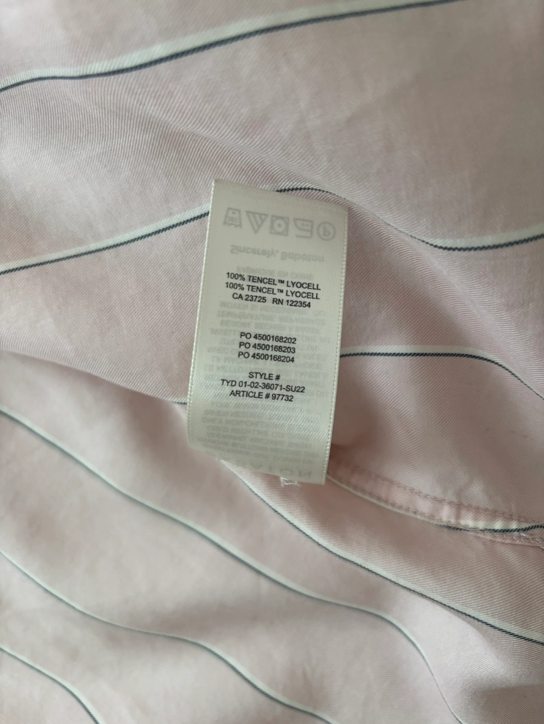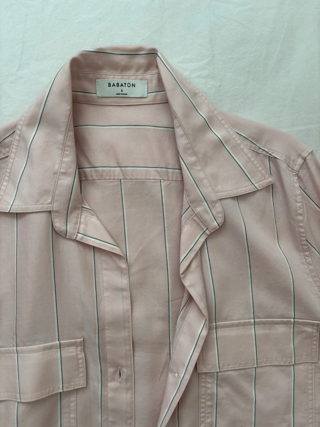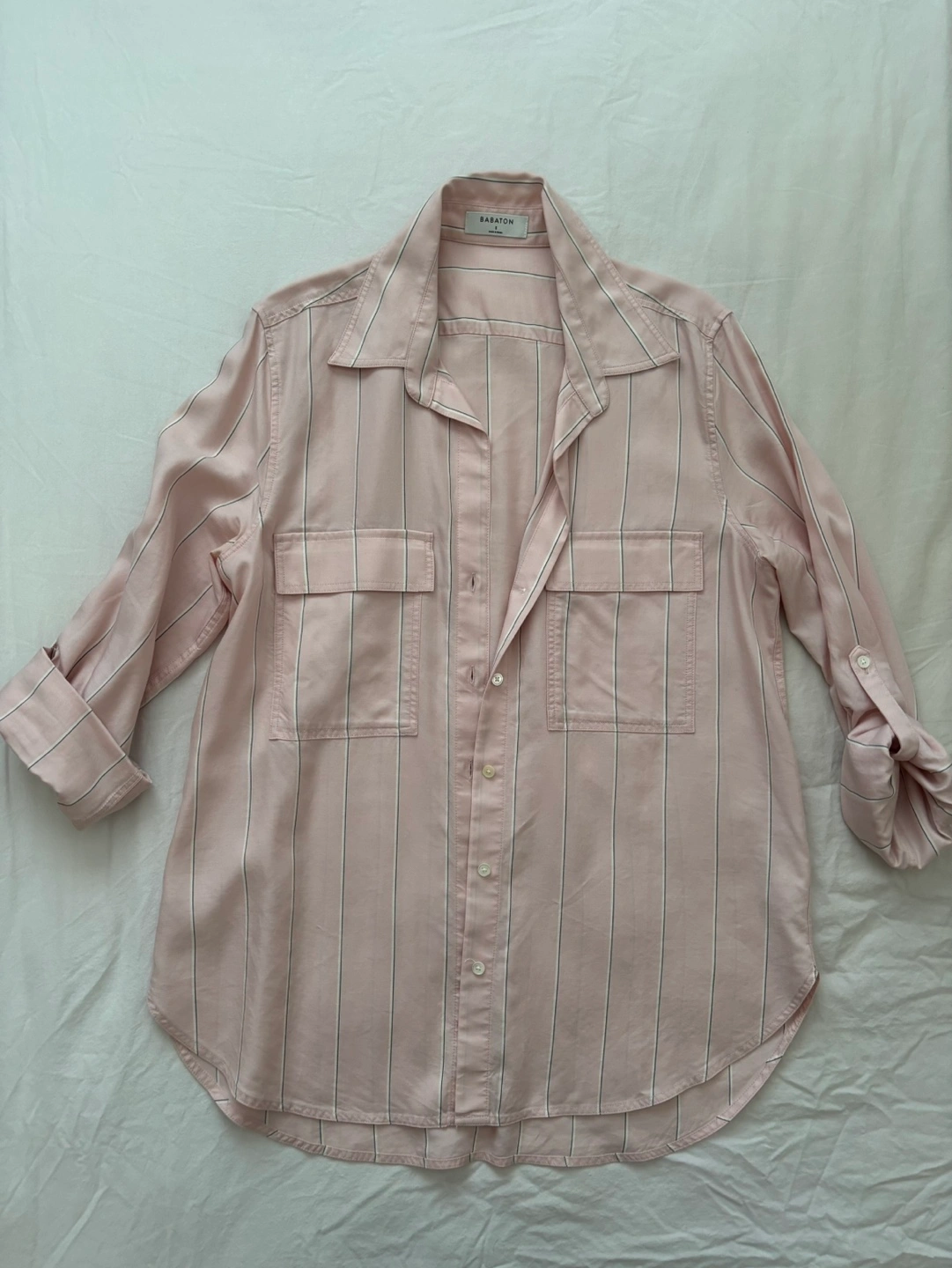 Pink and white striped button-down shirt. Rolled sleeves. Two chest pockets. Made of 100% Tencel Lyocell. Fabric drapes nicely, great for work.