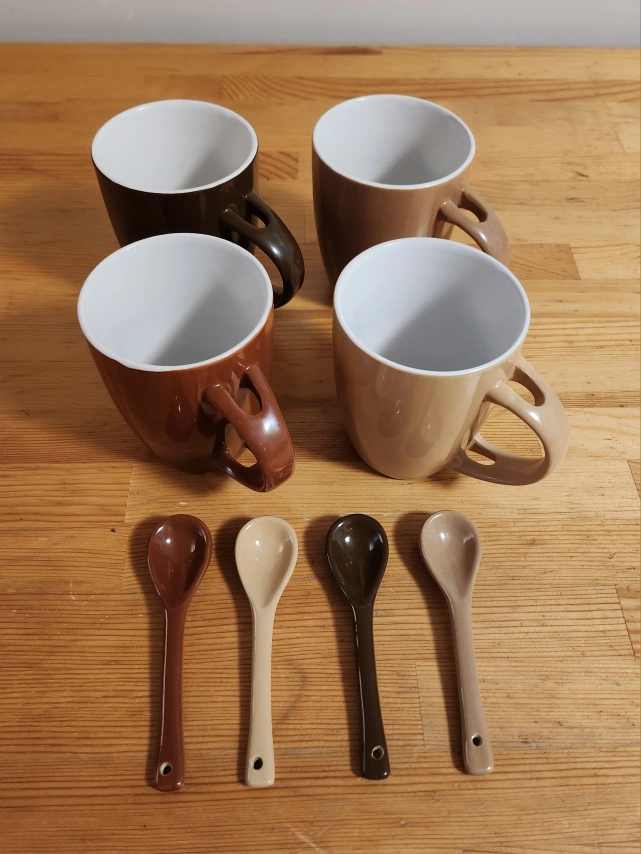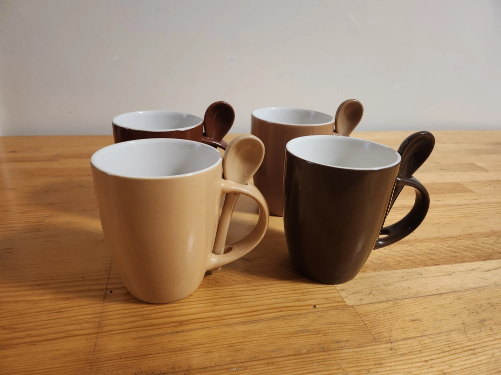 Four ceramic mugs, each with a matching colour spoon attached to the handle. Two brown and two beige mugs. Great for coffee, tea, or hot chocolate.