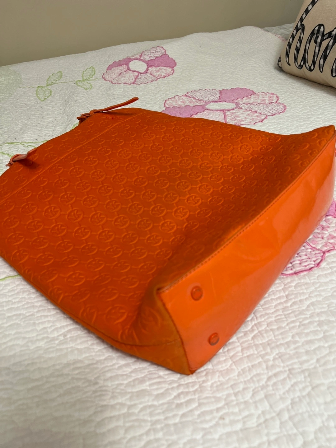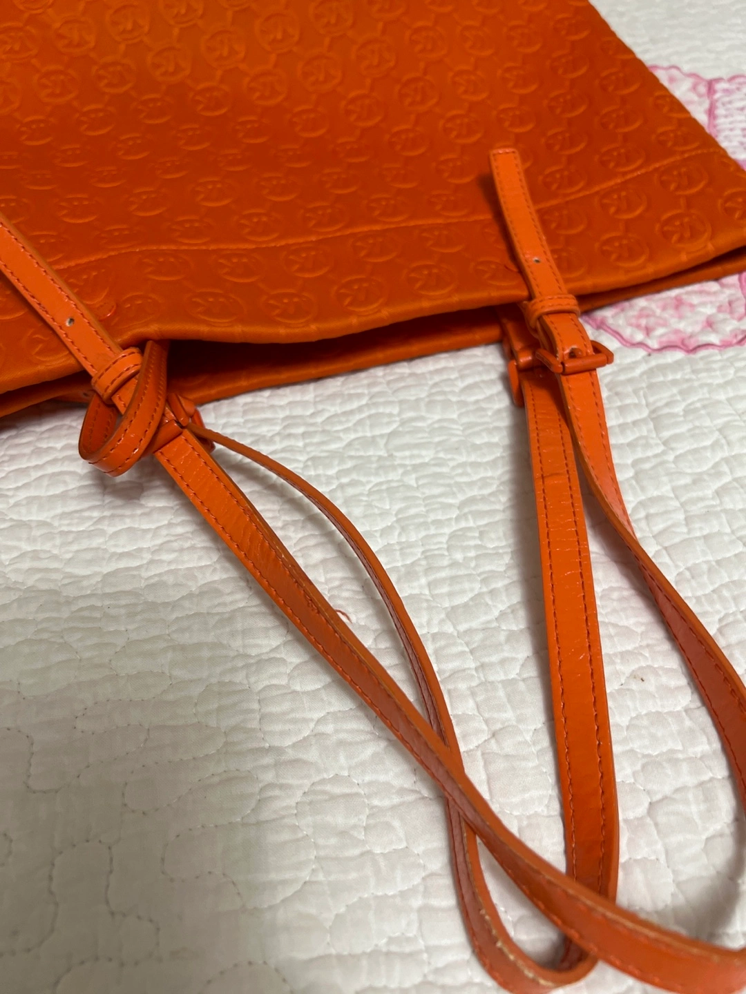 Large orange tote bag. Embossed logo throughout. Matching zip pouch included. Two long handles. Interior zip pocket.