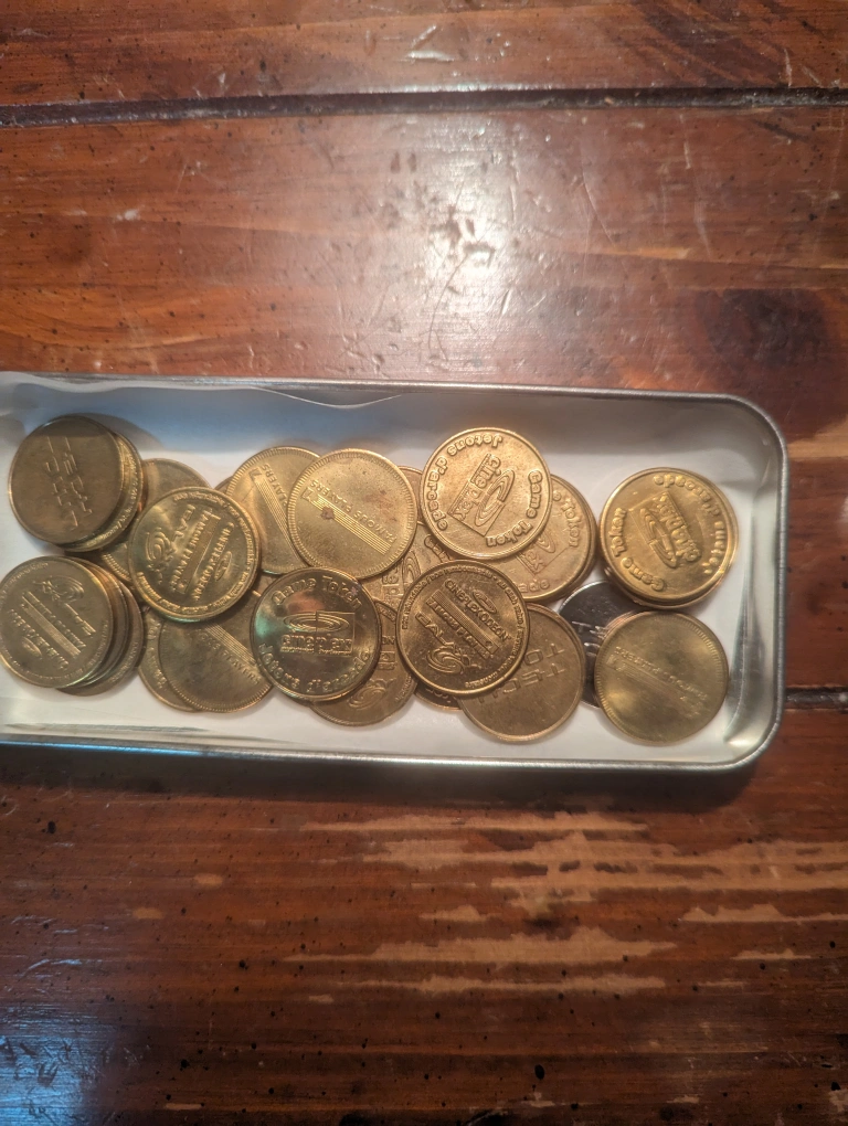27 metal Cineplex Famous Players video game tokens Gold-coloured.