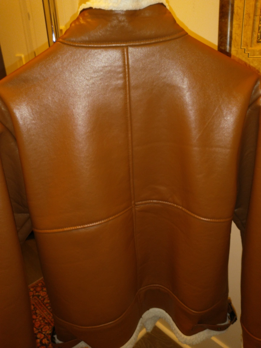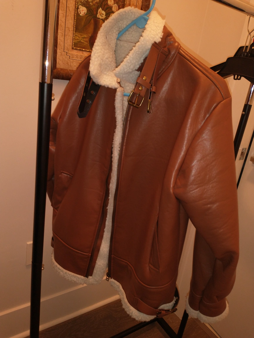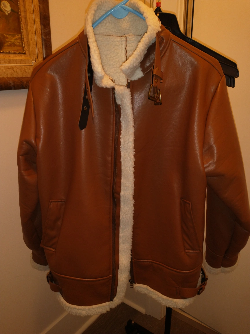 Men's brown faux leather aviator jacket. Features a sherpa lining, zipper closure, and buckle accents. Warm and stylish.