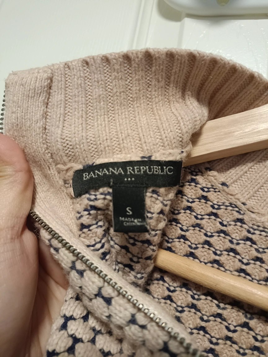 967Tan mock neck sweater with a subtle textured pattern. Features a half zip closure. Long sleeves. Size small.