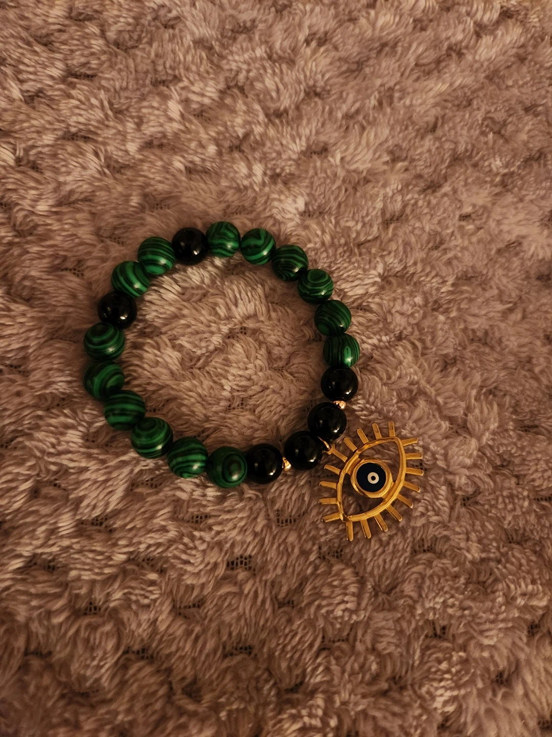 Handmade with love, a malachite and obsidian beaded bracelet with an evil eye charm. Best worn with no sleeves. Will fit a Small sized wrist comfortably.