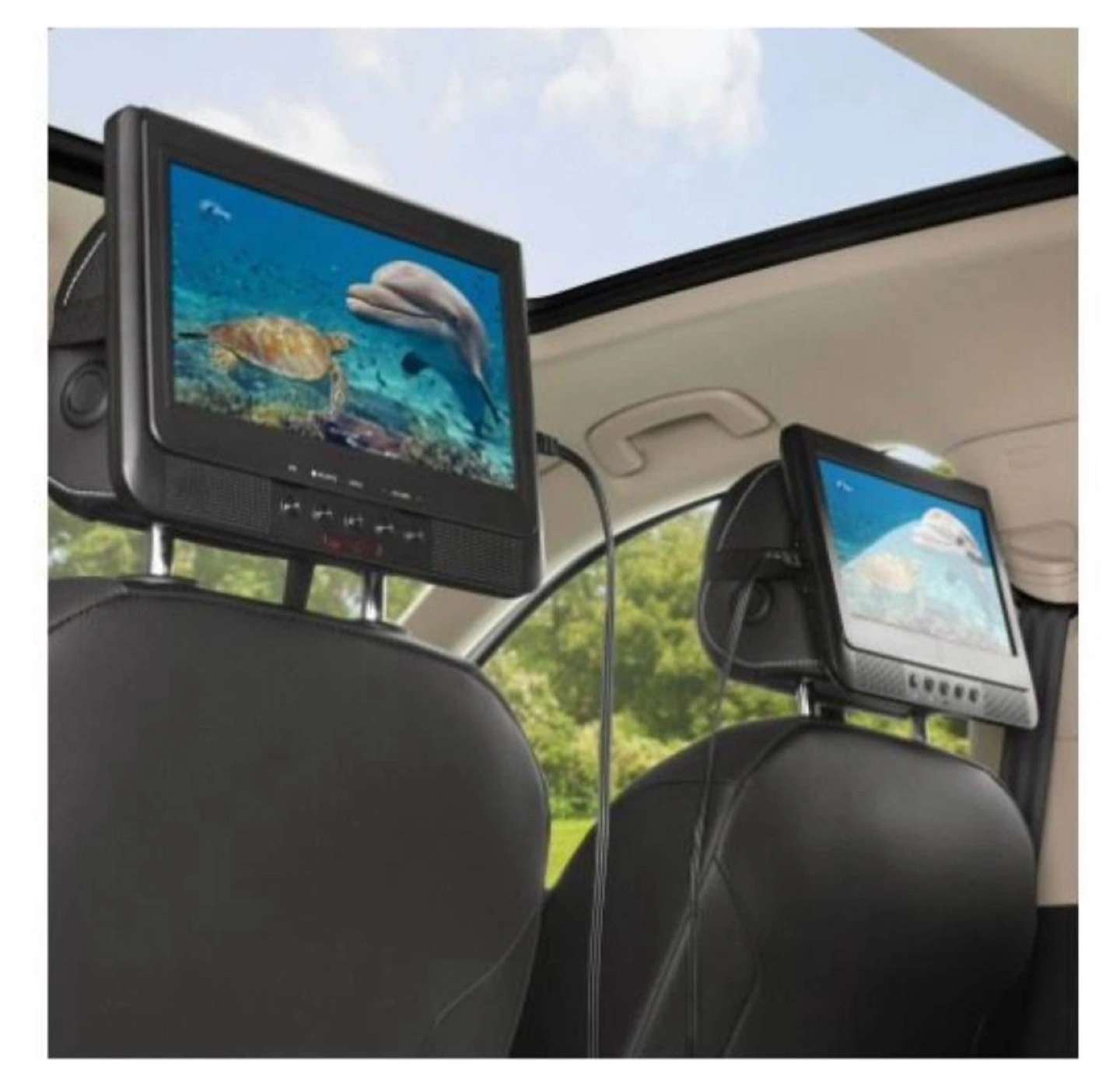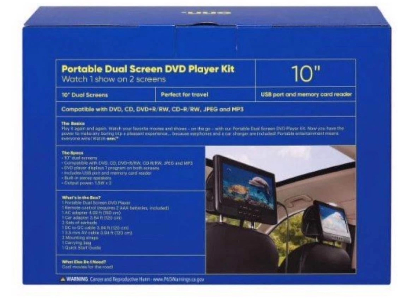 Do more than take your movies on the road—share them! With this dual-screen portable DVD player, you can maximize entertainment between two LCD screens. No one will miss any details with the 1024 x 600 native resolution display. Use the convenient headrest mounting straps to make every car ride a breeze. This onn. 10" Dual Screen DVD player includes: a remote control, which requires 2 AAA batteries(included), a 3.5mm audio/video cable, a DC to DC connection cable, two set of earbuds, an AC/DC power adapter, 12V DC car adapter, 2 headrest straps, a carry case with 3 organizing compartments, a Quick Start Guide and a complete User's Guide.