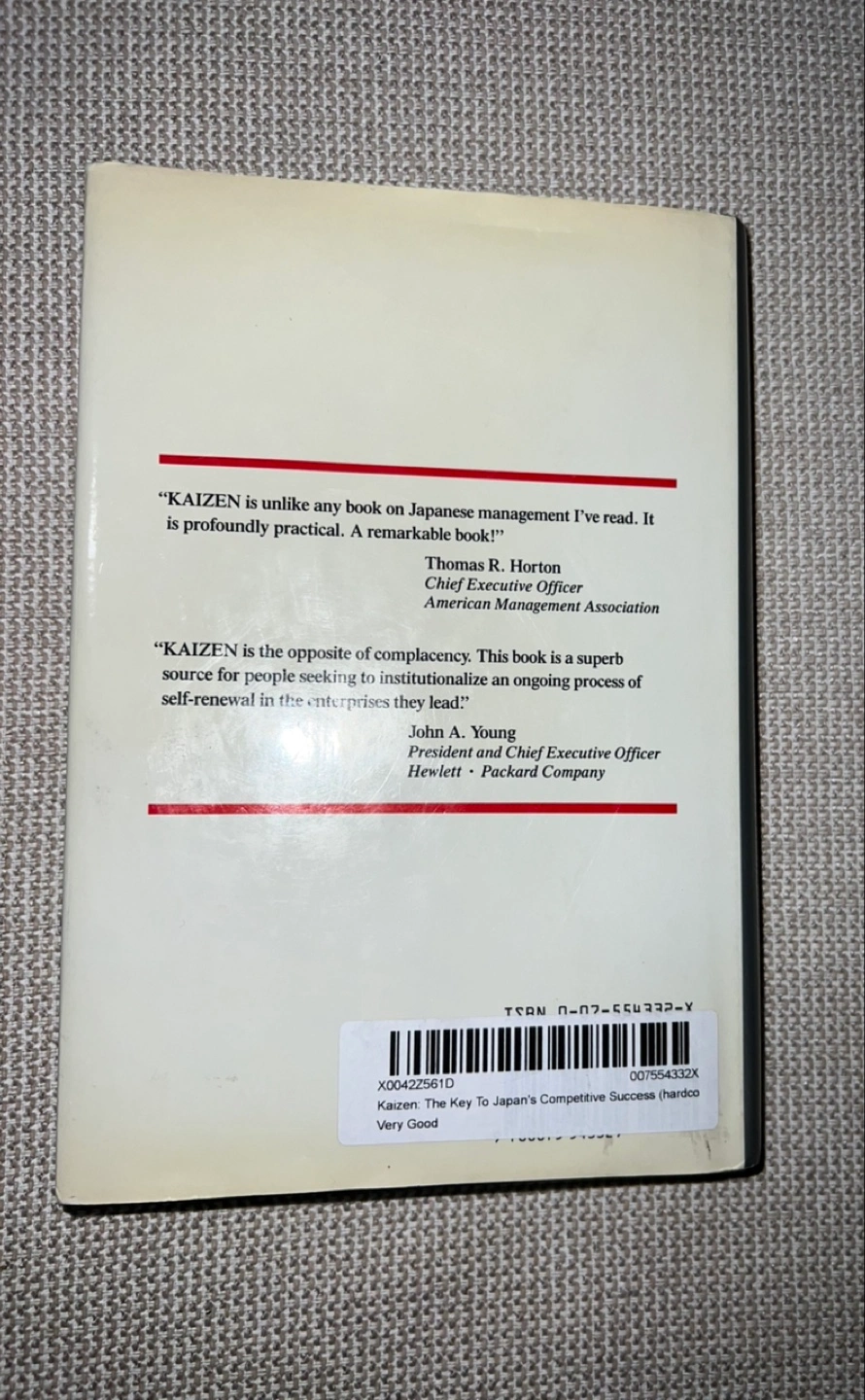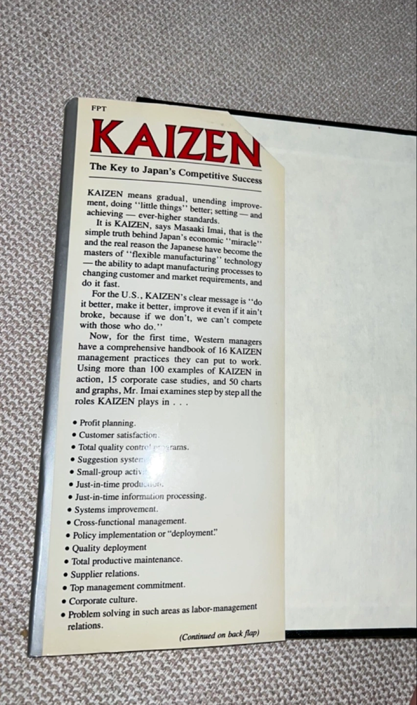 For the professional manager or student of management, a comprehensive handbook of 16 Kaizen management practices that can be put to work. KAIZEN uses more than 100 examples in action and contains 15 corporate case studies.