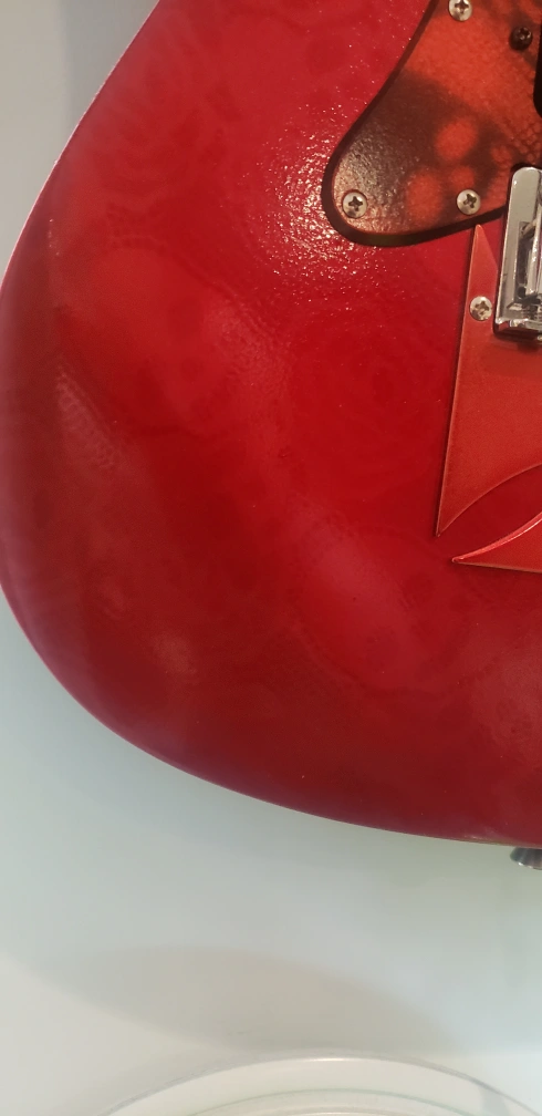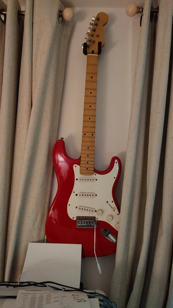 Red electric guitar. Includes tremolo bridge. Good condition. Plays well. squire, and no name guitar available.