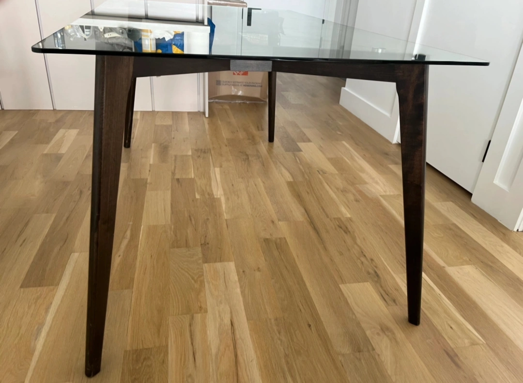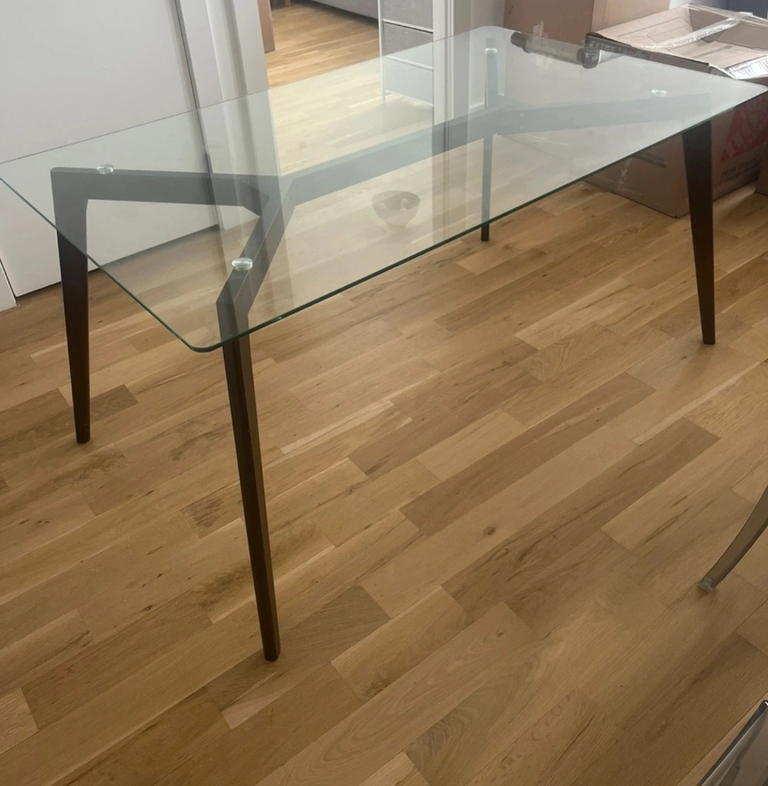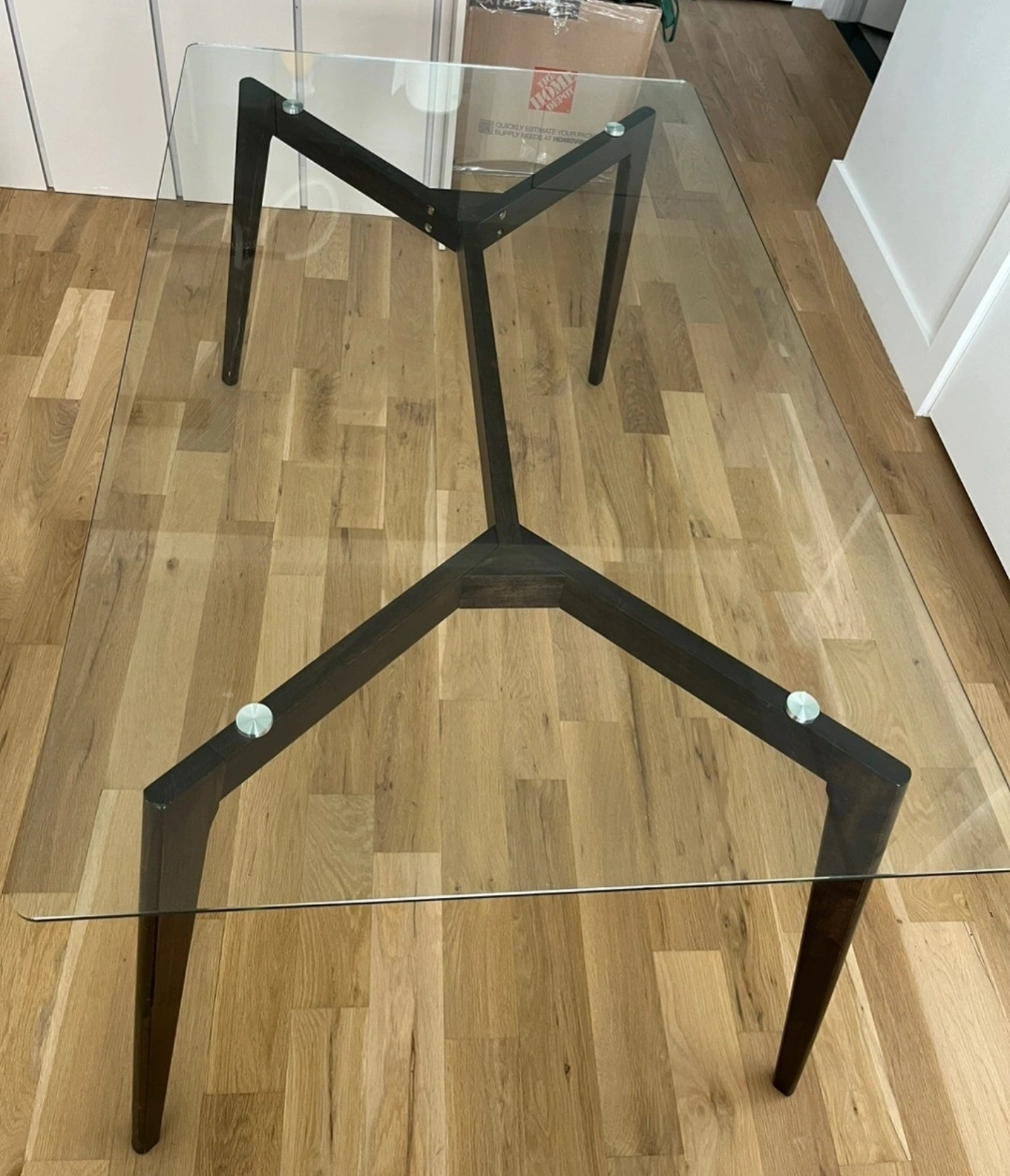 Currently purging and downsizing. Hate to part with this amazing modernist glass top rectangular table. Seemingly floats on slender wooden legs. The design keeps your space open. Can be used as a dining table for 6 or more, or a modern style desk/workspace. Legs come apart for easier transporting.