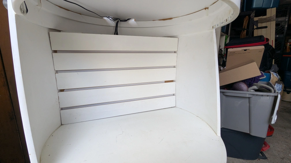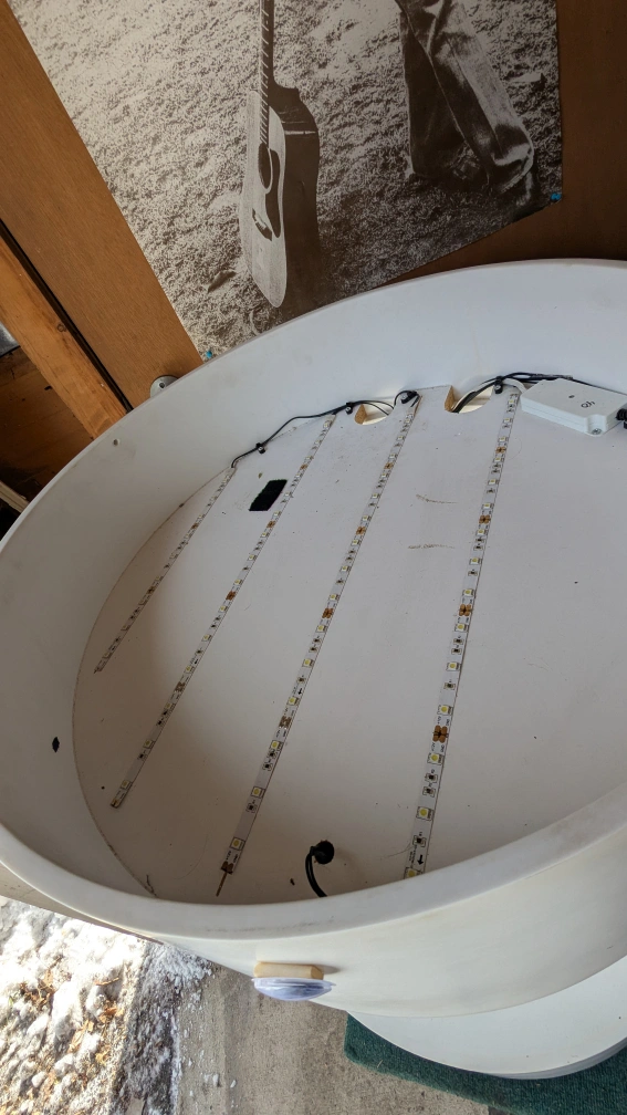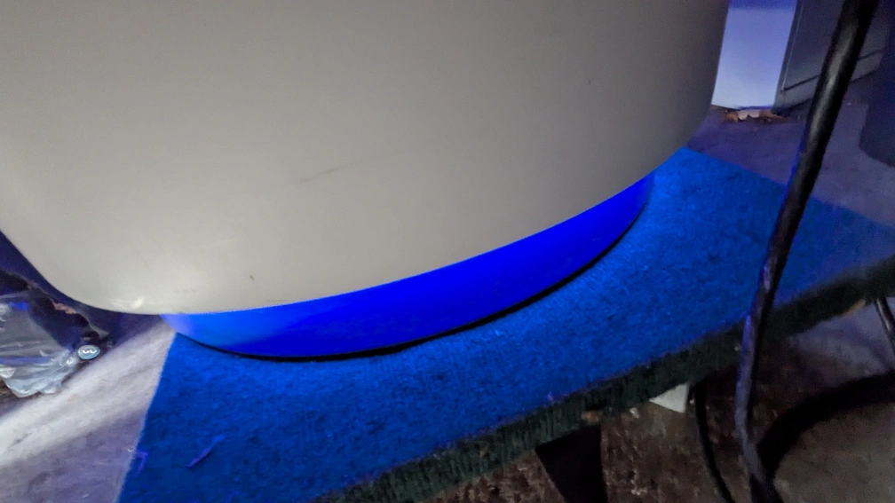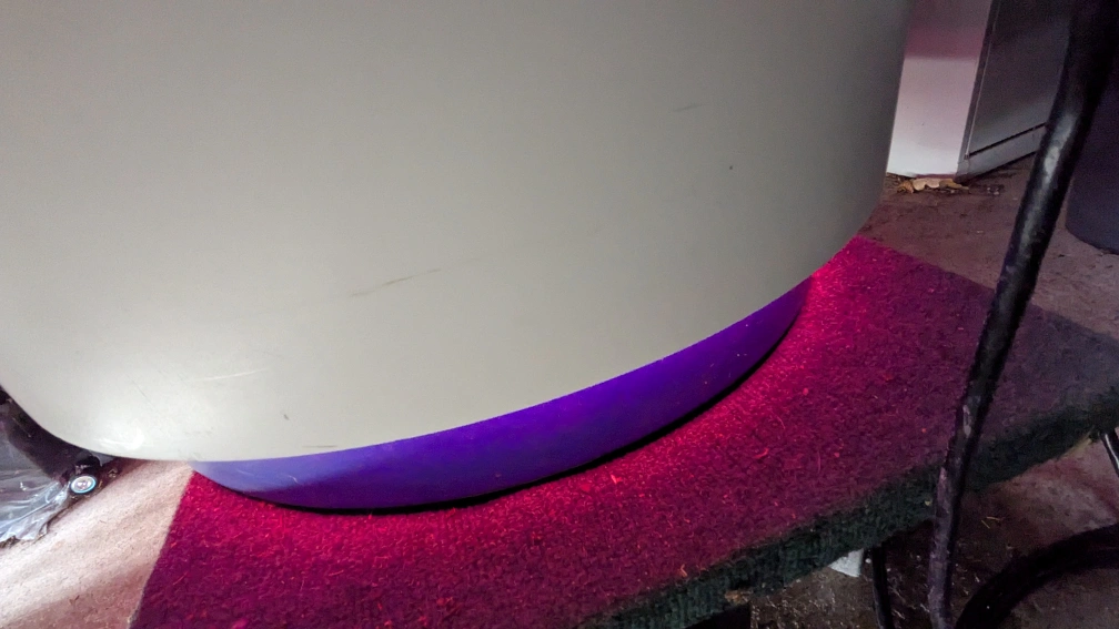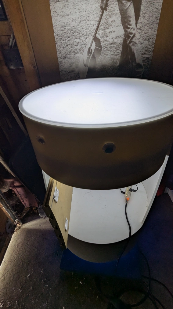 White LED lights shine through the frosted acrylic Top as an under light effect while the remote control RGB colour changing LED lights shine below the stand as a cool accent.