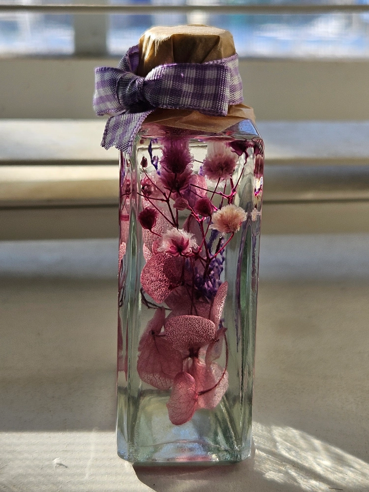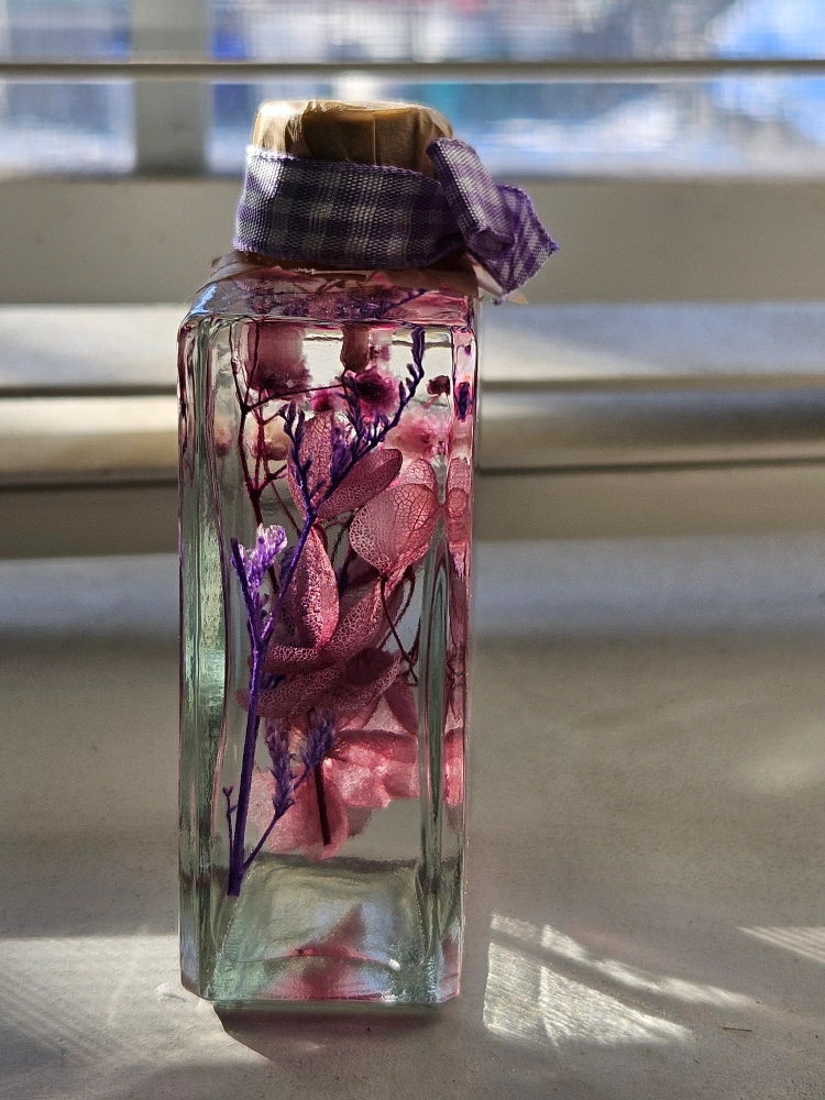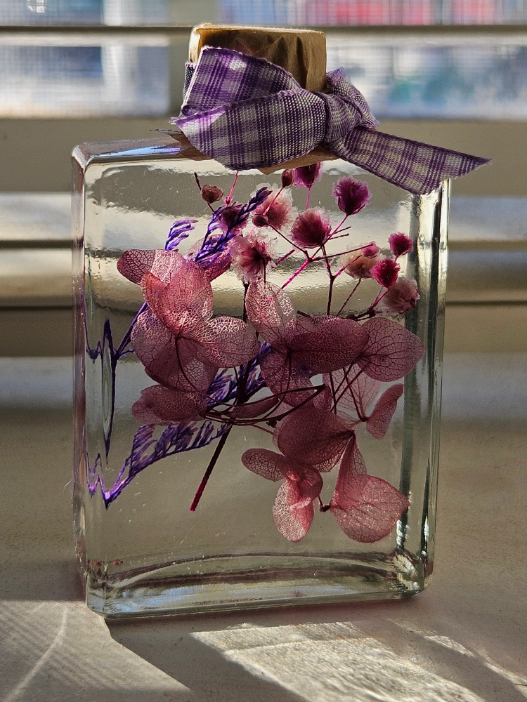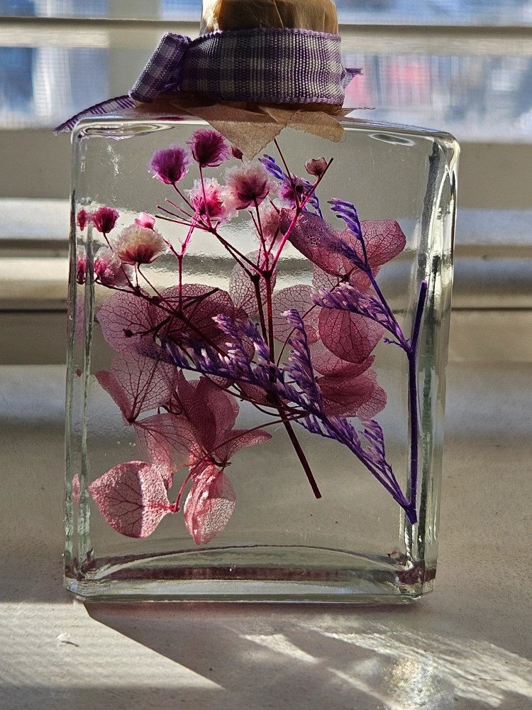 Small glass bottle, square shape. Contains preserved pink and purple flowers. Cork stopper with purple ribbon. Lovely decorative accent. Perfect Valentines gift!