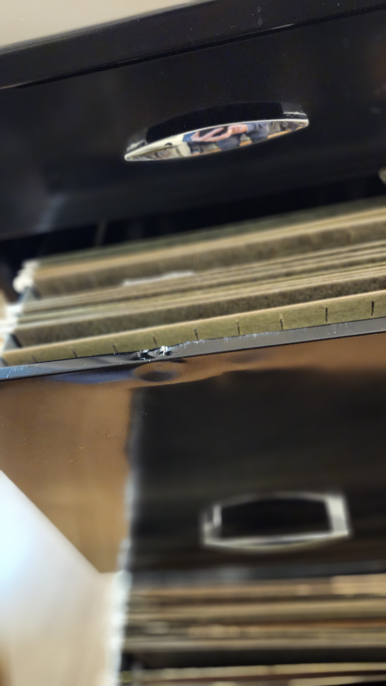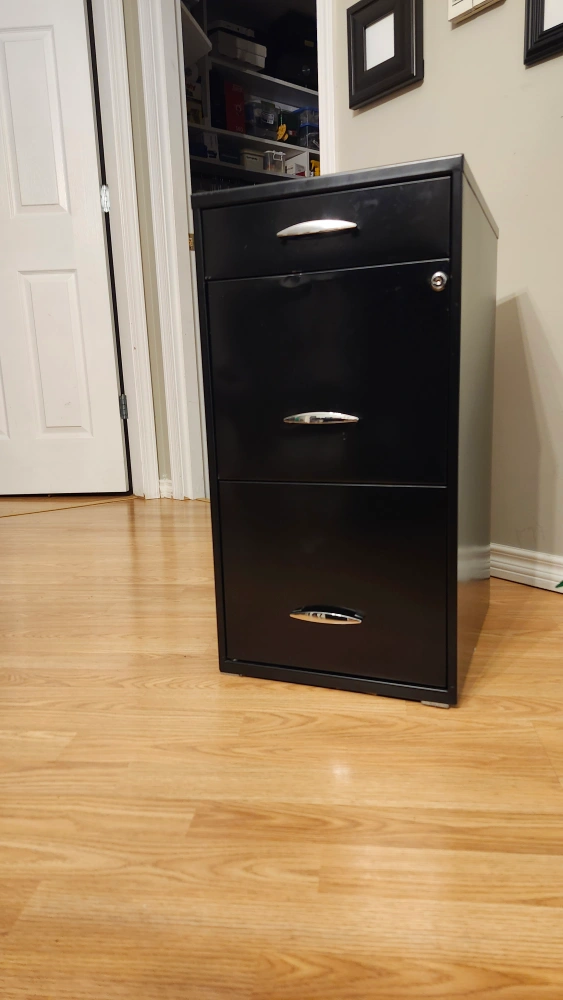 Black metal filing cabinet. Three drawers. Silver drawer pulls. Minor damage to one drawer. Perfect for office or home use. Fits nicely in a closet.