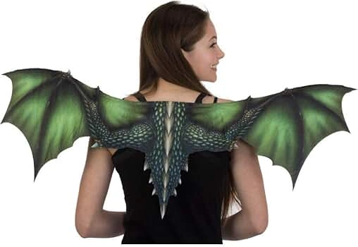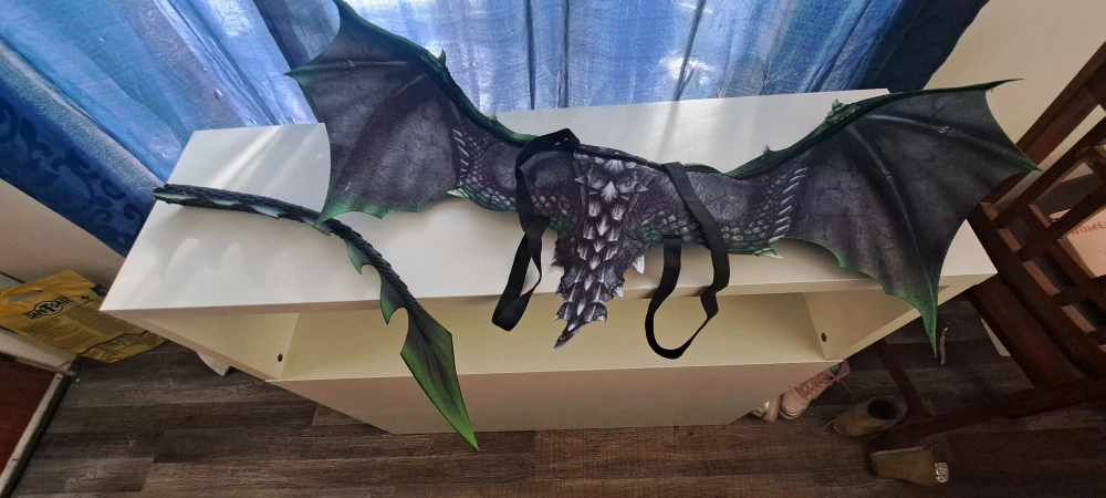 36-inch poly dragon wings. Green and black colour scheme. Includes matching tail. Great for cosplay or Halloween costumes. Hand wash only.