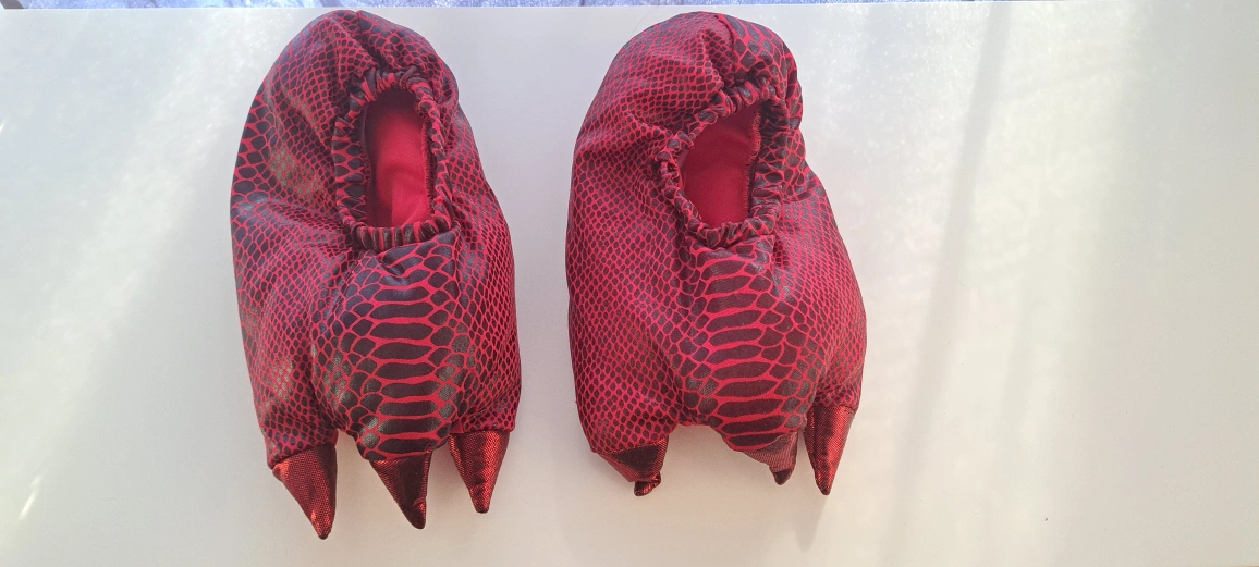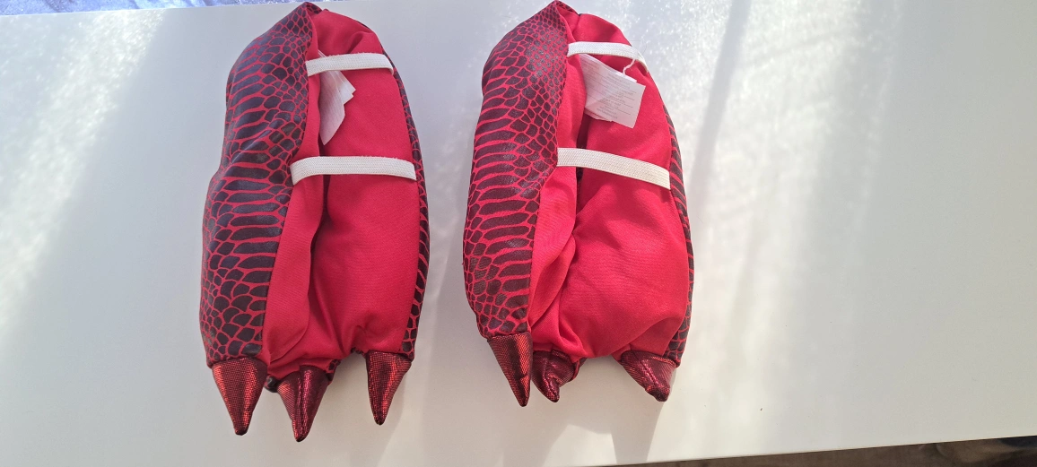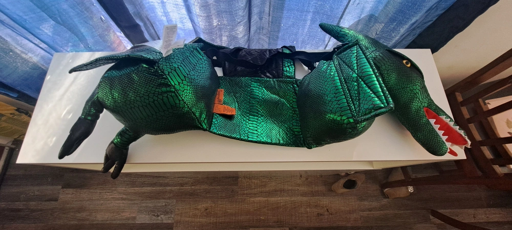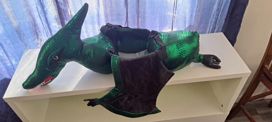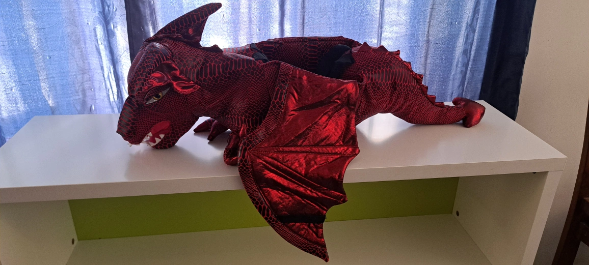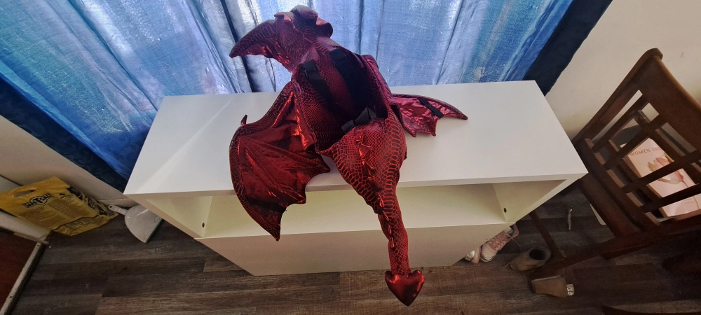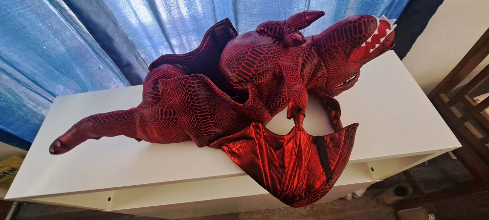 Child's dragon costume. Red and green options available. Soft plush material. Features large wings and a tail. Great for Halloween or imaginative play. Suitable for younger children. 2 available, red or green, (red comes with shoes).