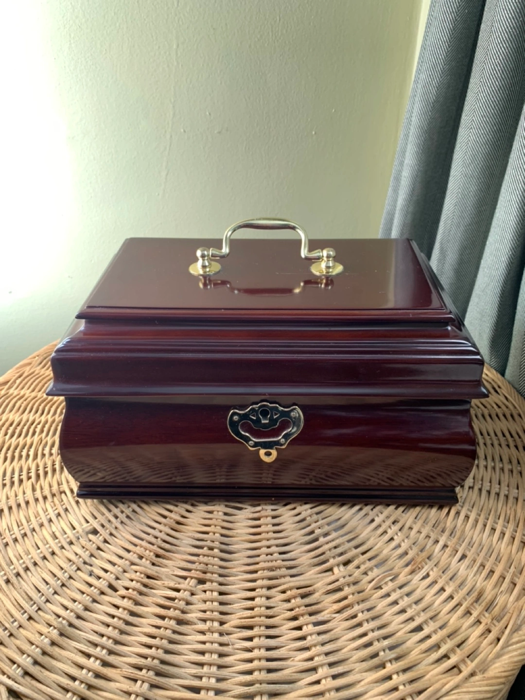 Buy & SellDark Wooden Vintage Jewellery BoxDark Wooden Vintage Jewellery Box$6Dark brown wooden jewellery box with a glossy lacquered finished, comes with two working keys, some minor damage as pictured From Bombay and Co.1 chats·1 favorites·62 viewsSELLERKaitlinCricket Club36137 reviewsWHERE TO MEETNear Aroma on avenue