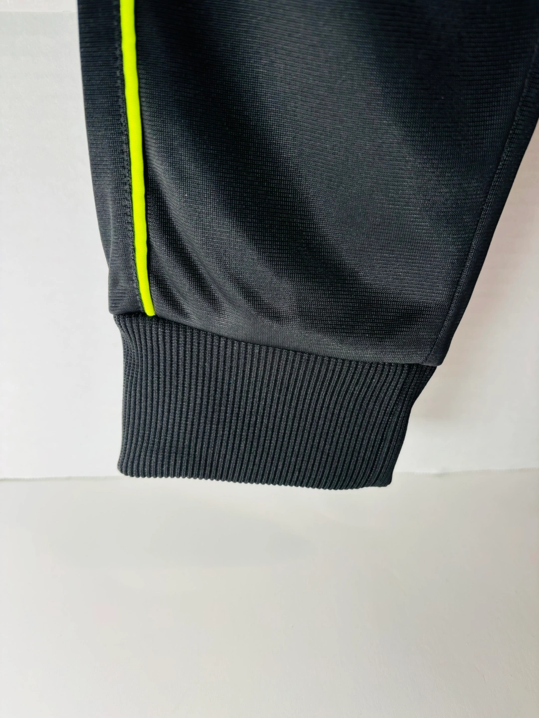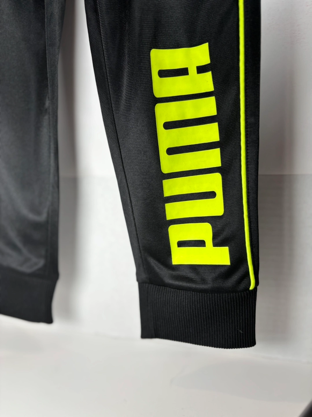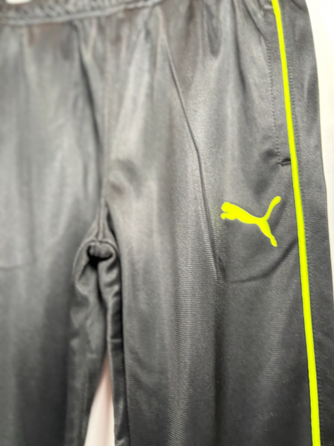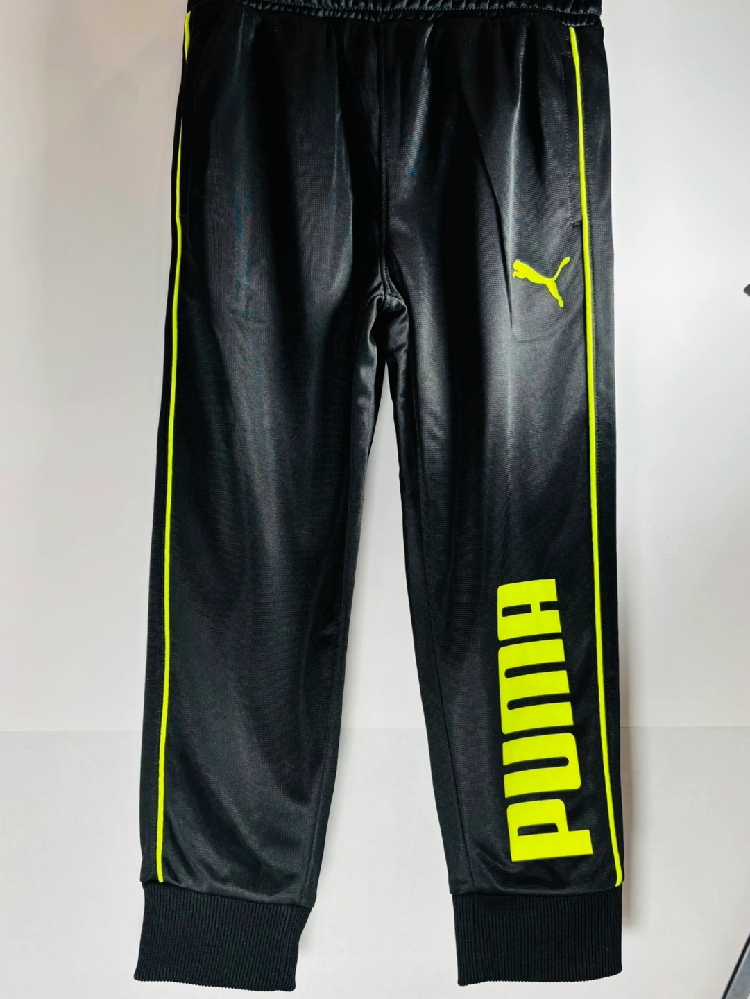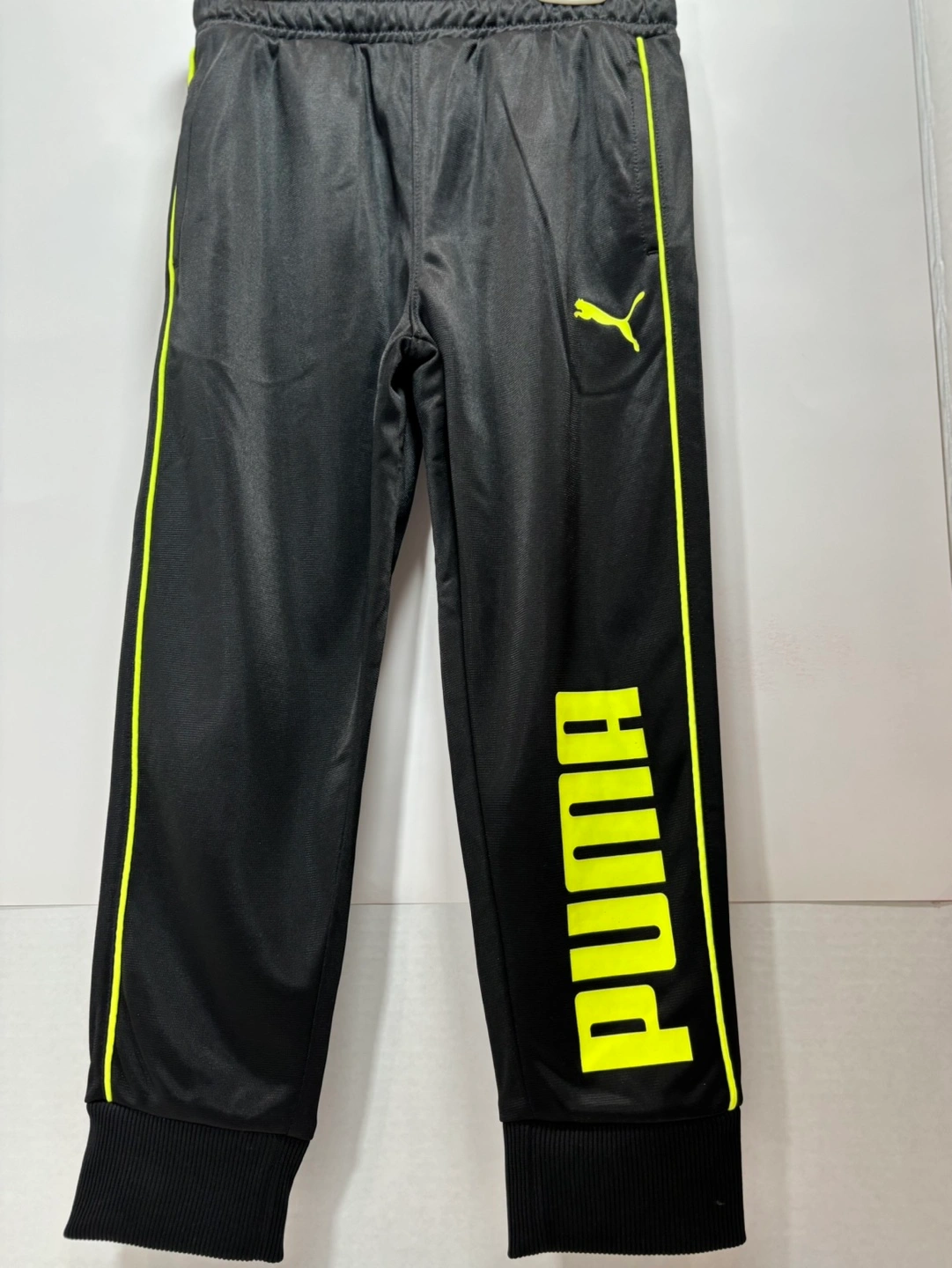 Black youth track pants. Elastic waistband. Neon yellow side stripes and Puma logo. Cuffed bottoms. Great for sports or casual wear. Size small 5.