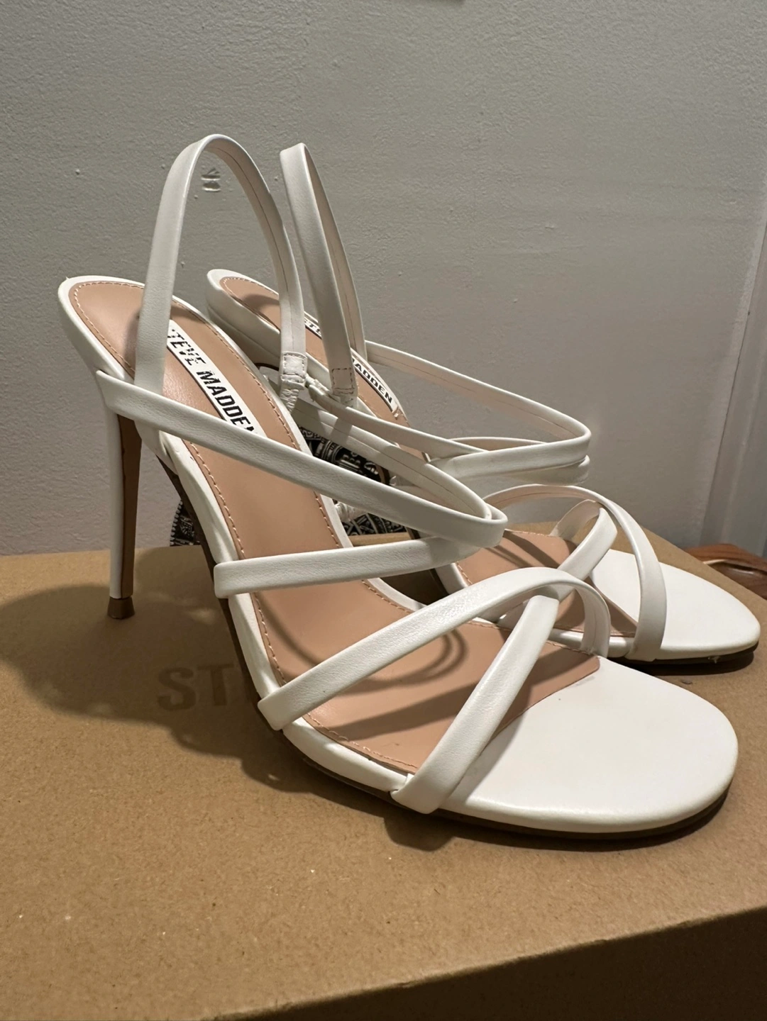 Steve Madden white heels. Size 7M. Ankle strap and stiletto heel. Minimal wear.