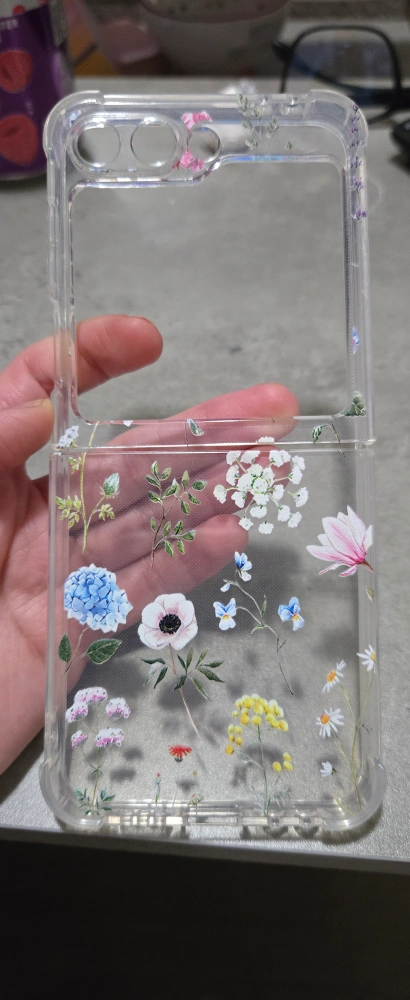 Clear phone case. Floral design. Compatible with Samsung Galaxy Z Flip 6. Lightweight, protective, shock absorbent, flexible but tough structured material.
