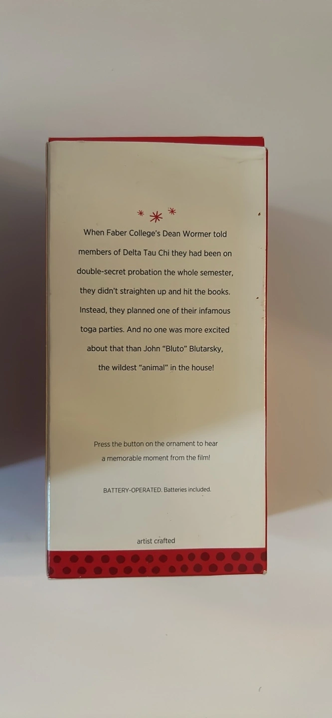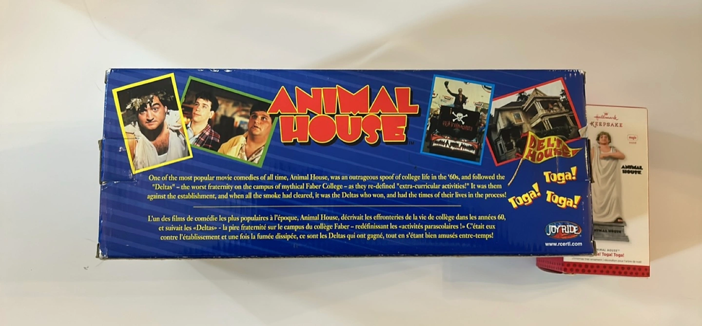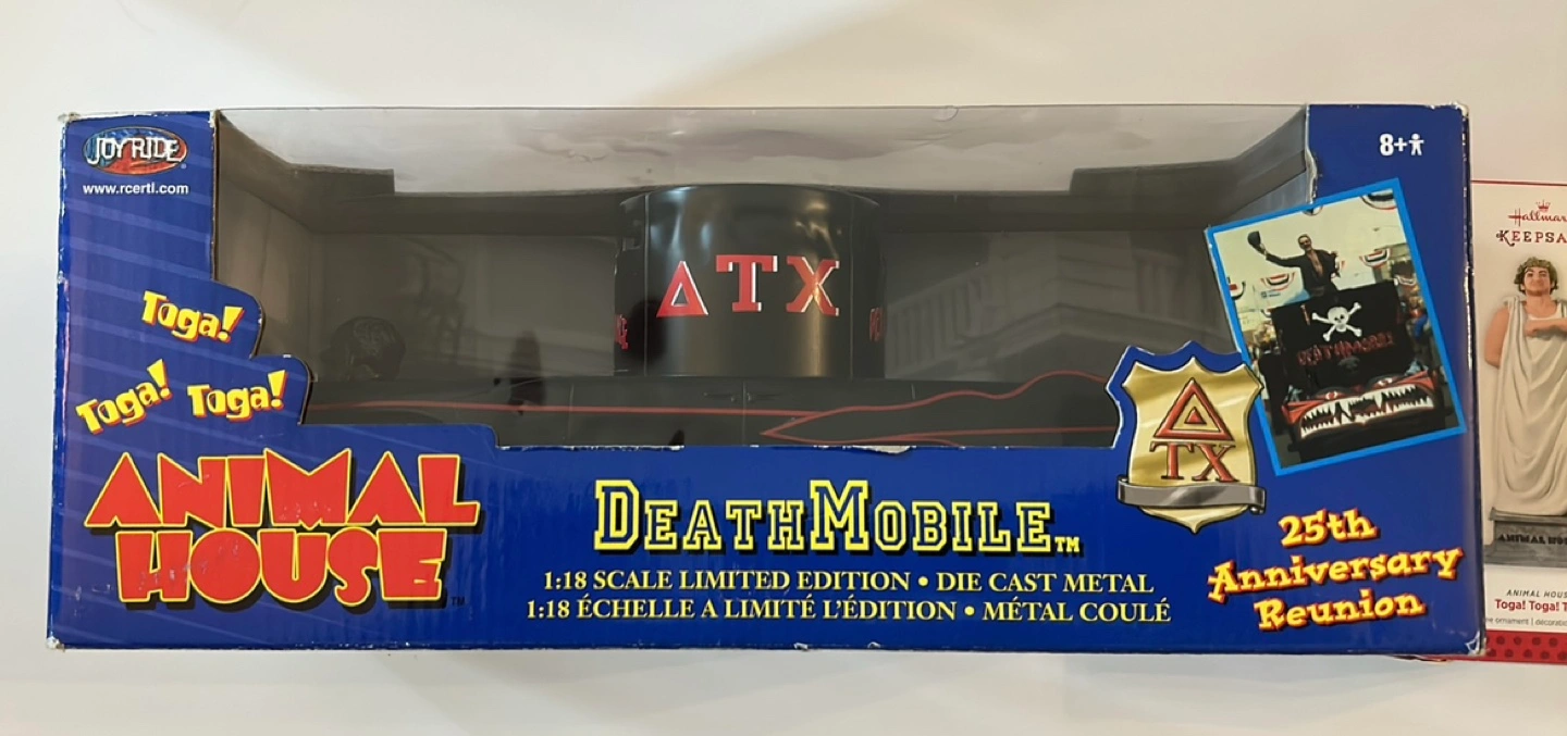 Joy Ride 1:18 scale limited edition die-cast metal Animal House Deathmobile. Features detailed interior and chassis, opening doors and hood, steerable front wheels. Part of the 25th Anniversary Reunion collection. Includes Hallmark Keepsake Ornament of John Belushi in infamous Toga, Toga, Toga scene with is perfectly to scale as the car.