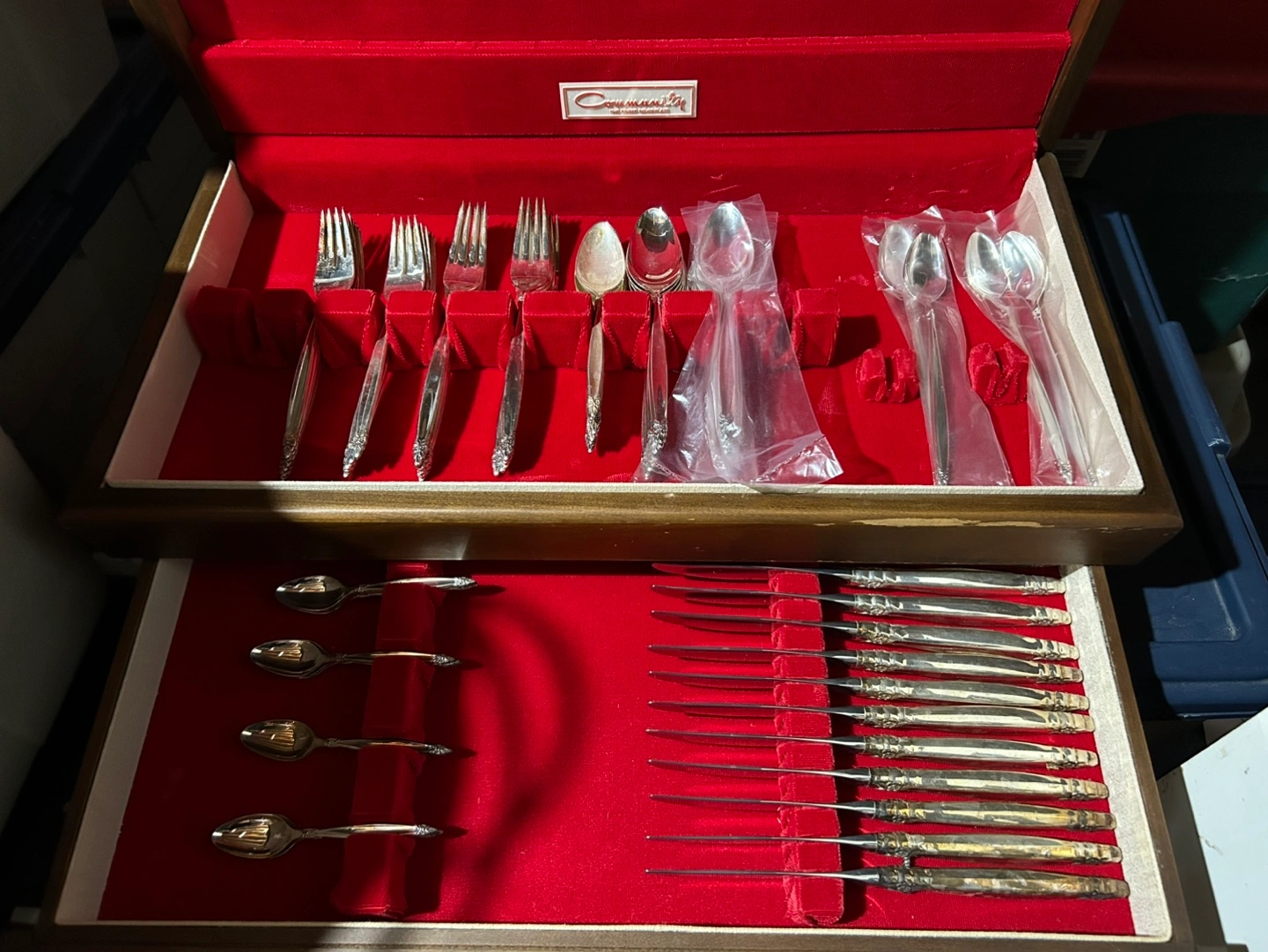 Vintage Community silverware set. Includes knives, forks, spoons. 68 pieces. Stored in a wooden case with red velvet lining.