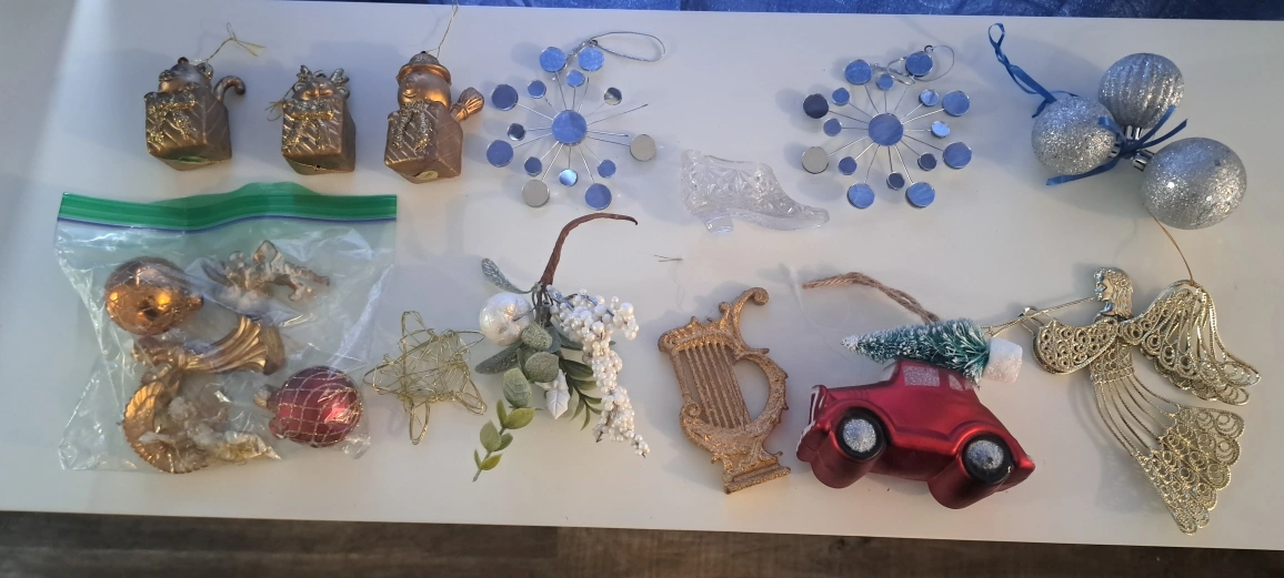 Collection of unique Christmas tree ornaments. Includes glass balls, gold angels, a lyre, a red car, and a crystal shoe. Various styles and colours. Perfect for adding a touch of vintage charm to your holiday decor. If interested send me a message. -David