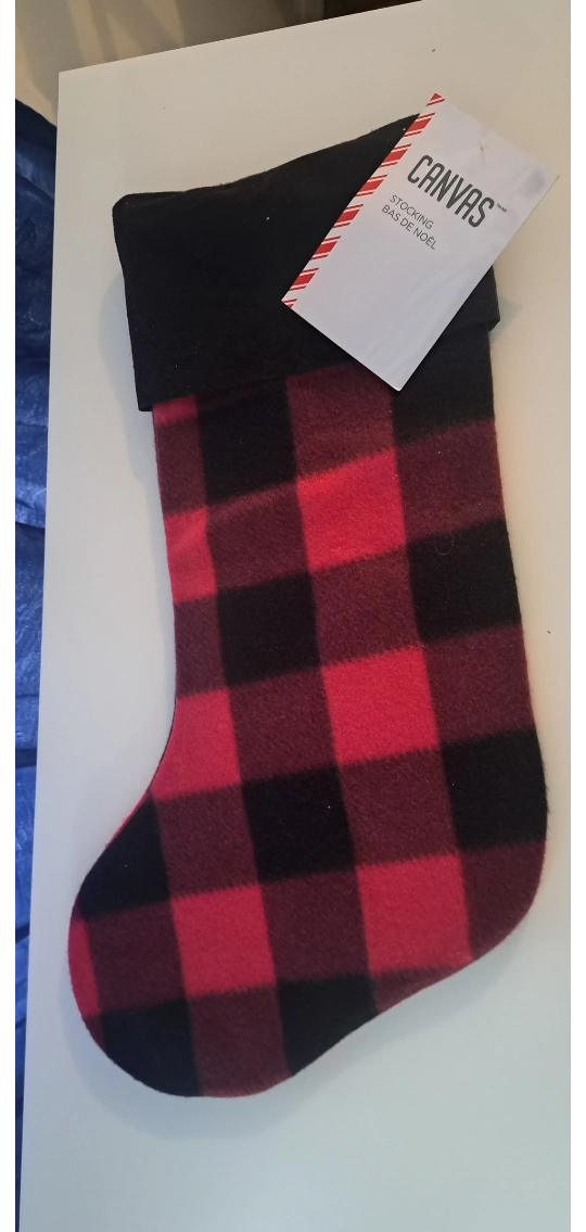 New Christmas stocking. Red and black buffalo check pattern. Fleece material. Black cuff. Measures approximately 18 inches long.