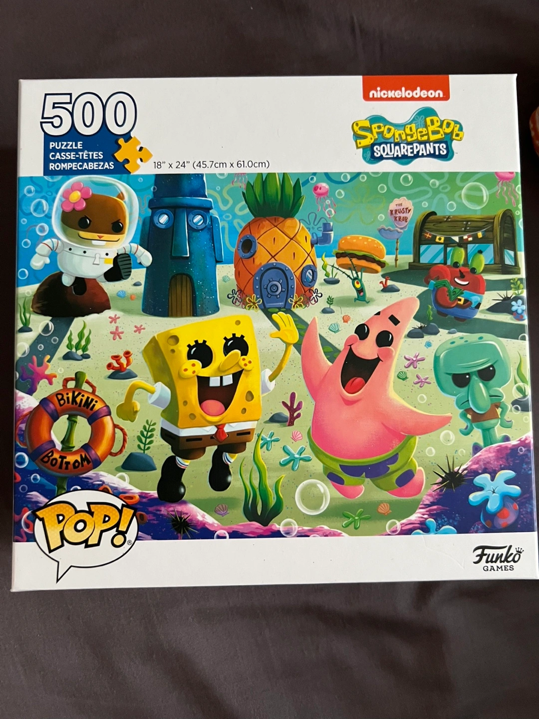 500-piece jigsaw puzzle. Features SpongeBob Squarepants characters. 18" x 24" dimensions. Funko Games.