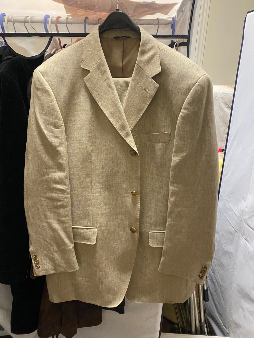 53Men's suit, beige colour. Linen material. Two-piece suit, jacket and pants. Three-button jacket. Classic style.