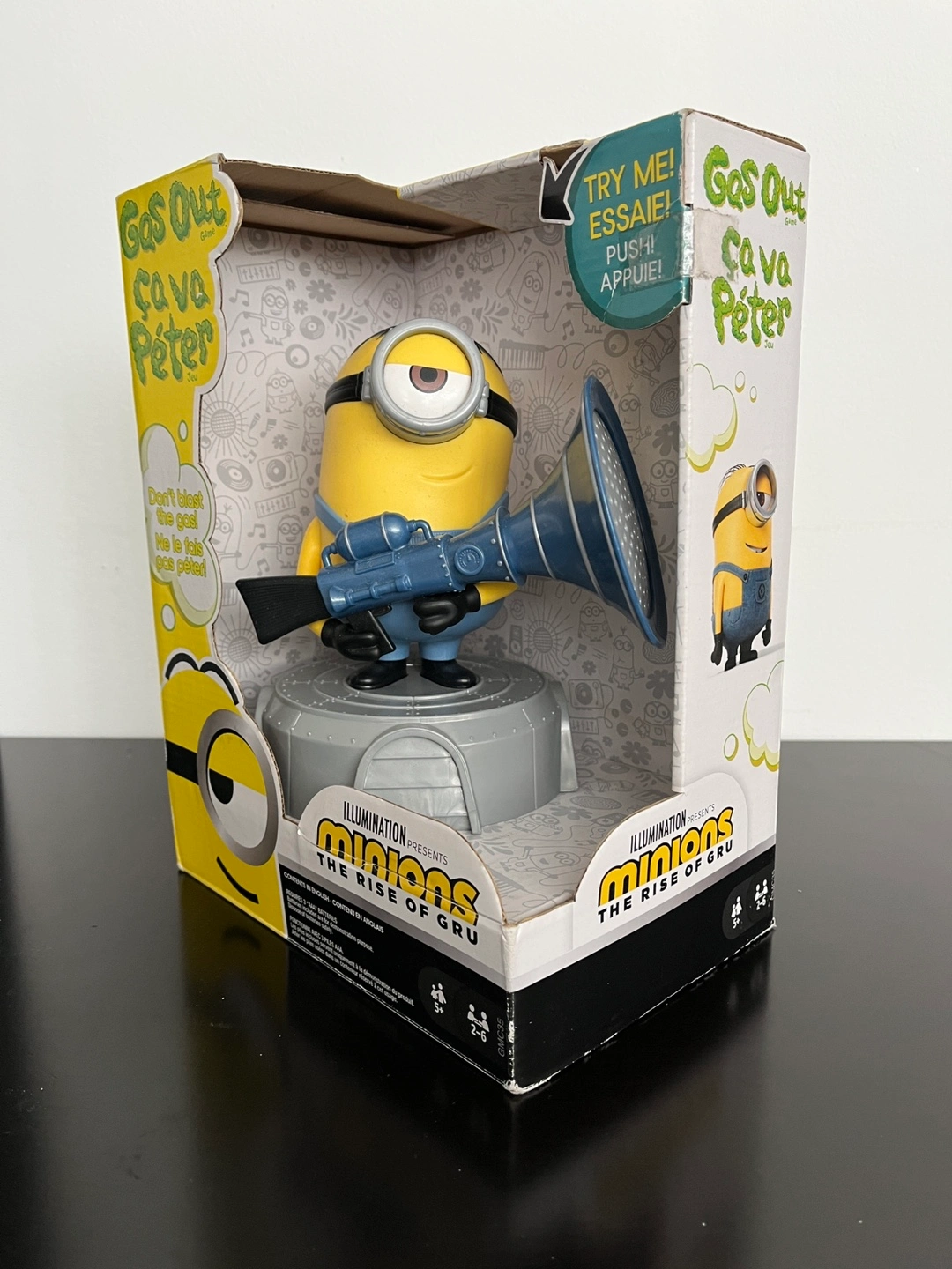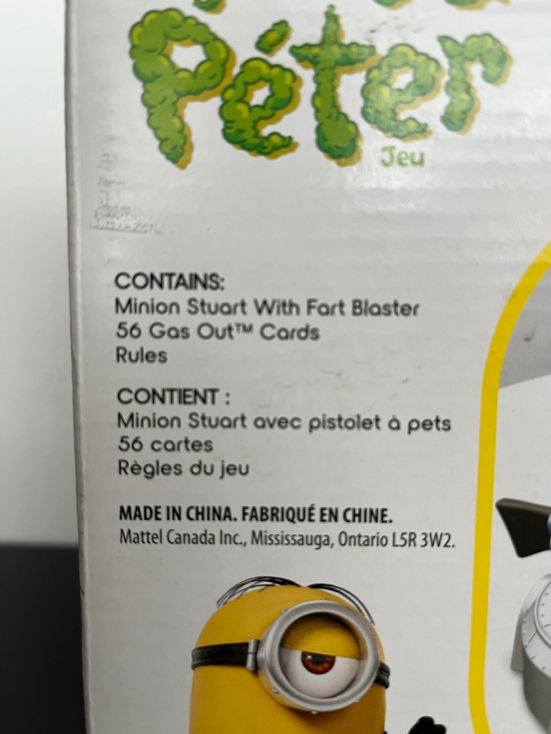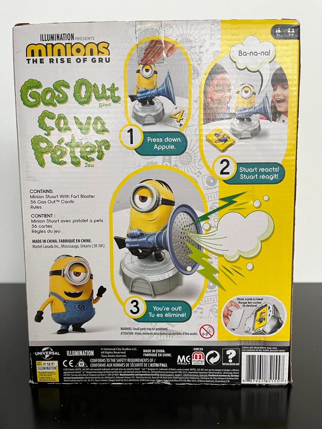 1000+Minion Stuart figure with fart blaster. Includes 56 Gas Out cards and rules. Ages 5+. Made in China.