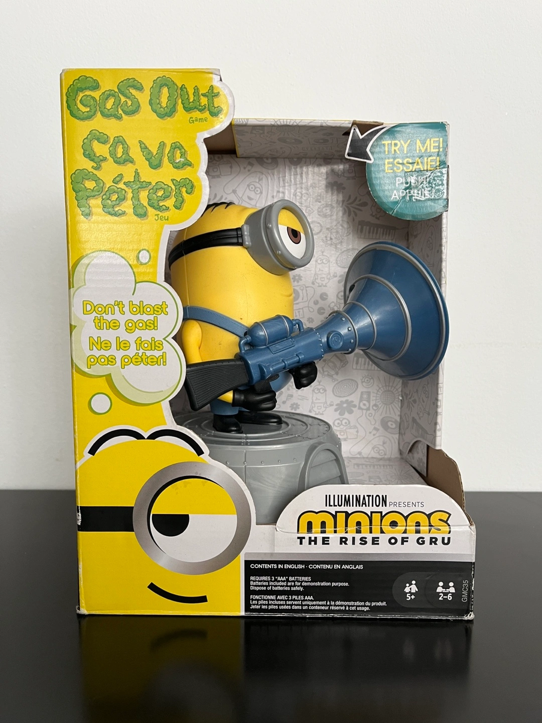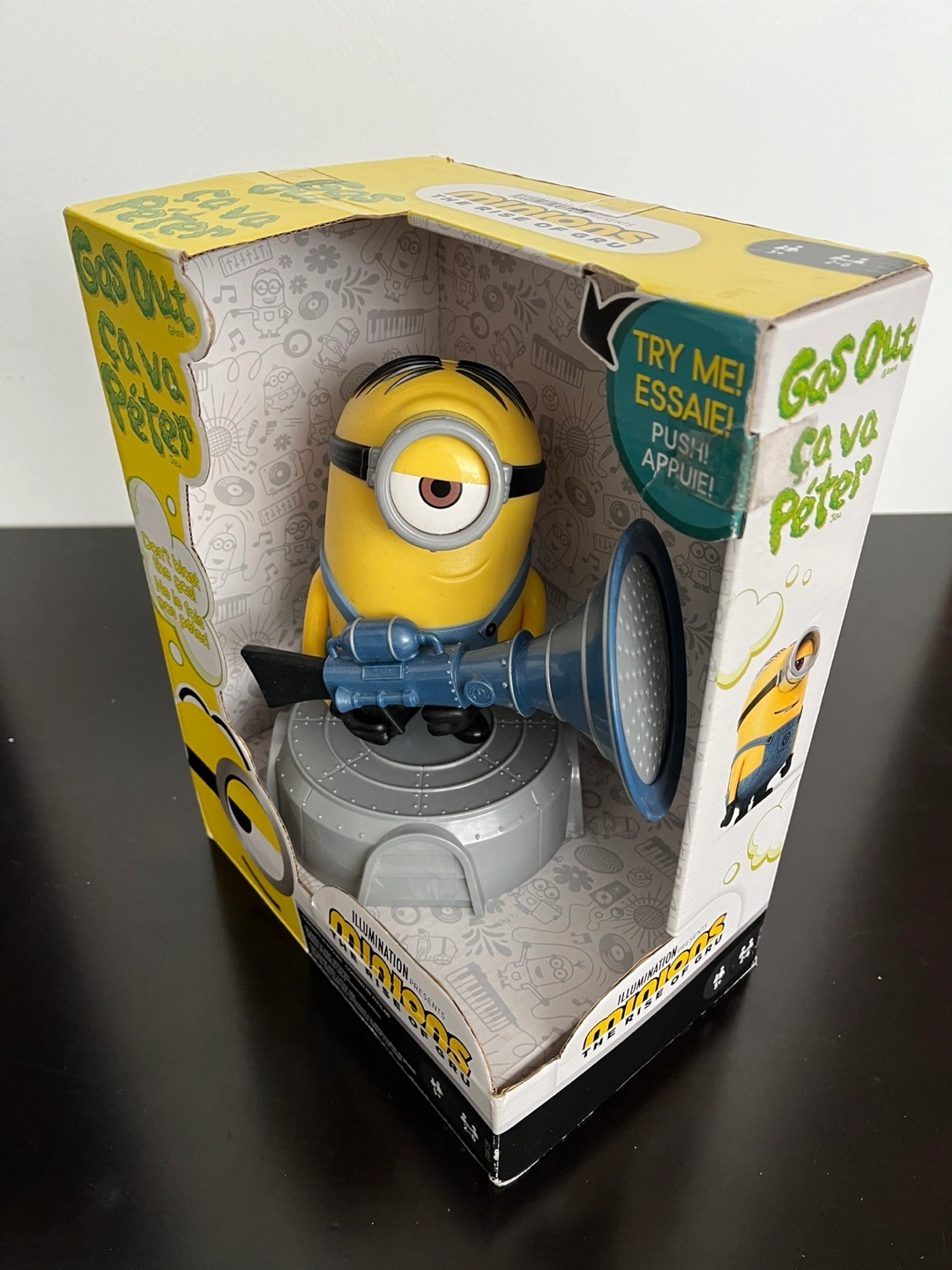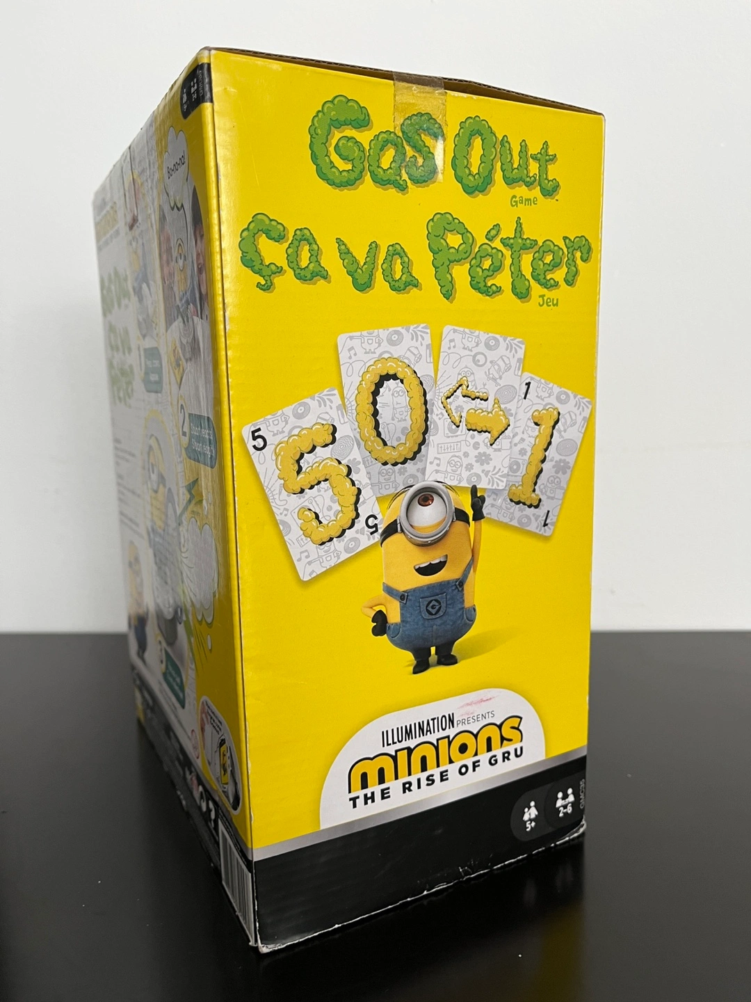 1000+Minion Stuart figure with fart blaster. Includes 56 Gas Out cards and rules. Ages 5+. Made in China.