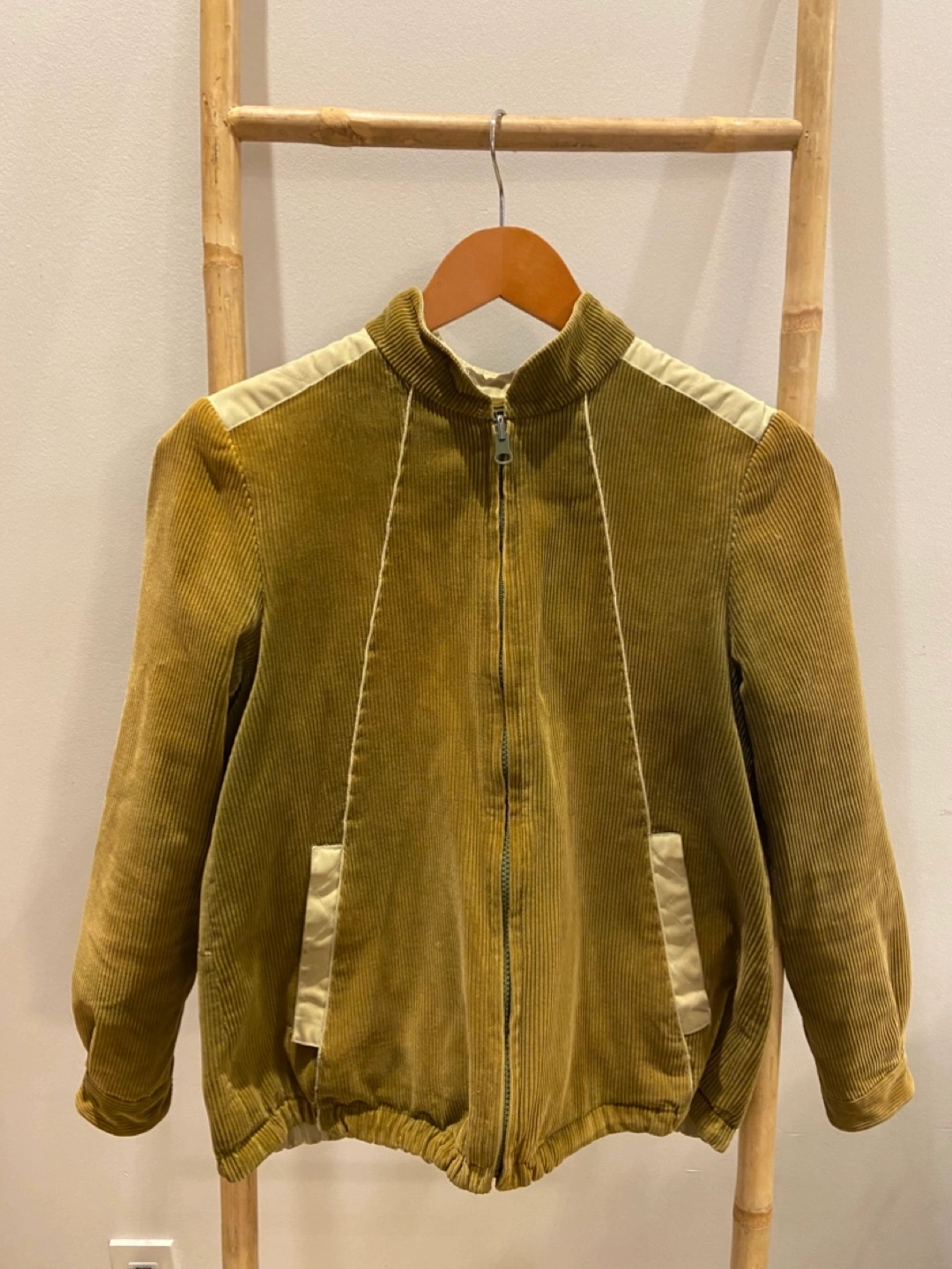 Olive green corduroy zip-up jacket. Features contrasting beige panels. Long sleeves with button cuffs. Relaxed fit. Amazing darting in the back. Perfect on its own or for winter layering. MEASUREMENTS: Shoulder to Sleeve: 22” Pit to Pit: 17.5” Total Length: 23”