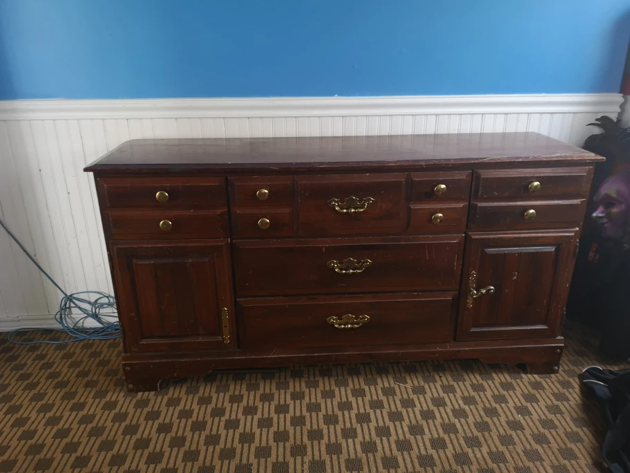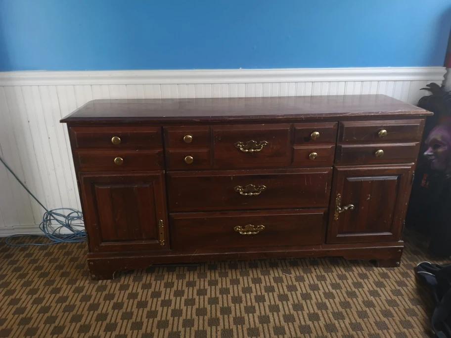 Six-drawer dresser. Dark brown wood finish. Some minor scratches and wear. Features brass hardware. Two side cabinets. Comes with mirror