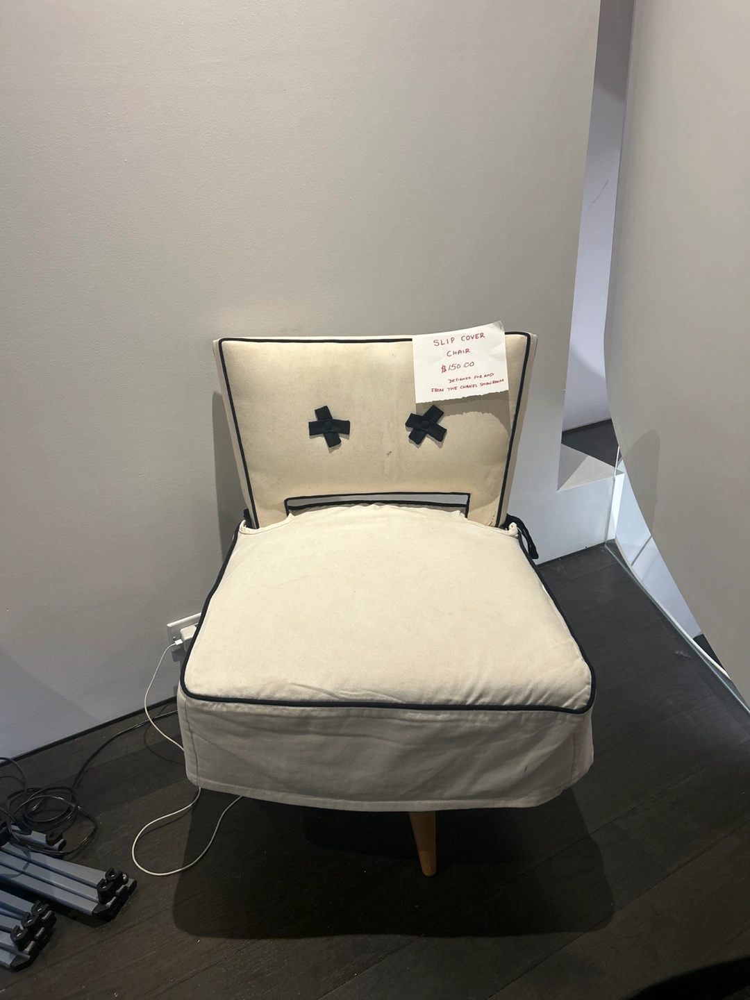 Cream-coloured fabric chair. Features a removable slipcover. Dark piping detail. Wooden legs. Cute design accents. Inspired by a Chanel jacket and used in a Chanel showroom