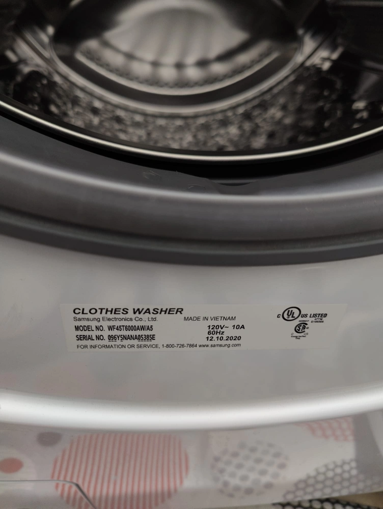 White Samsung washer and dryer. Stackable design. Various wash cycles. Dryer in good condition, washer loud on spin cycle. Model number WF47R6300AW/A5. Serial number 96YSNANAB385E.