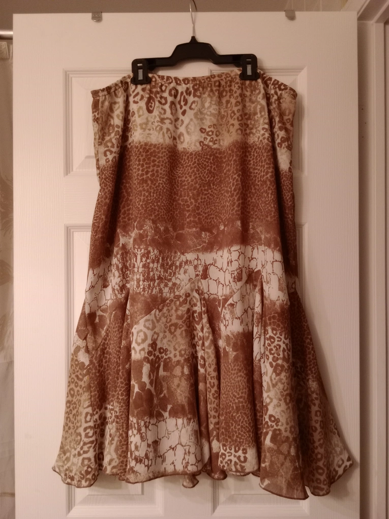 Stylish midi skirt. Features an A-line silhouette and a beautiful brown and beige animal print design. Flowy and comfortable fabric. Suitable for various occasions.