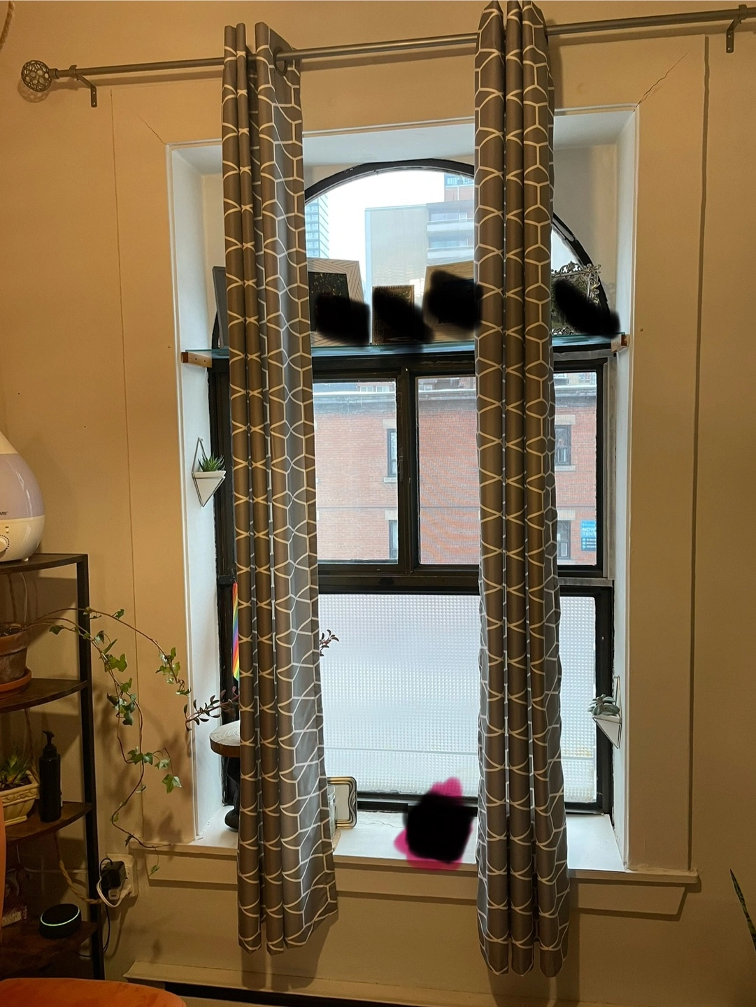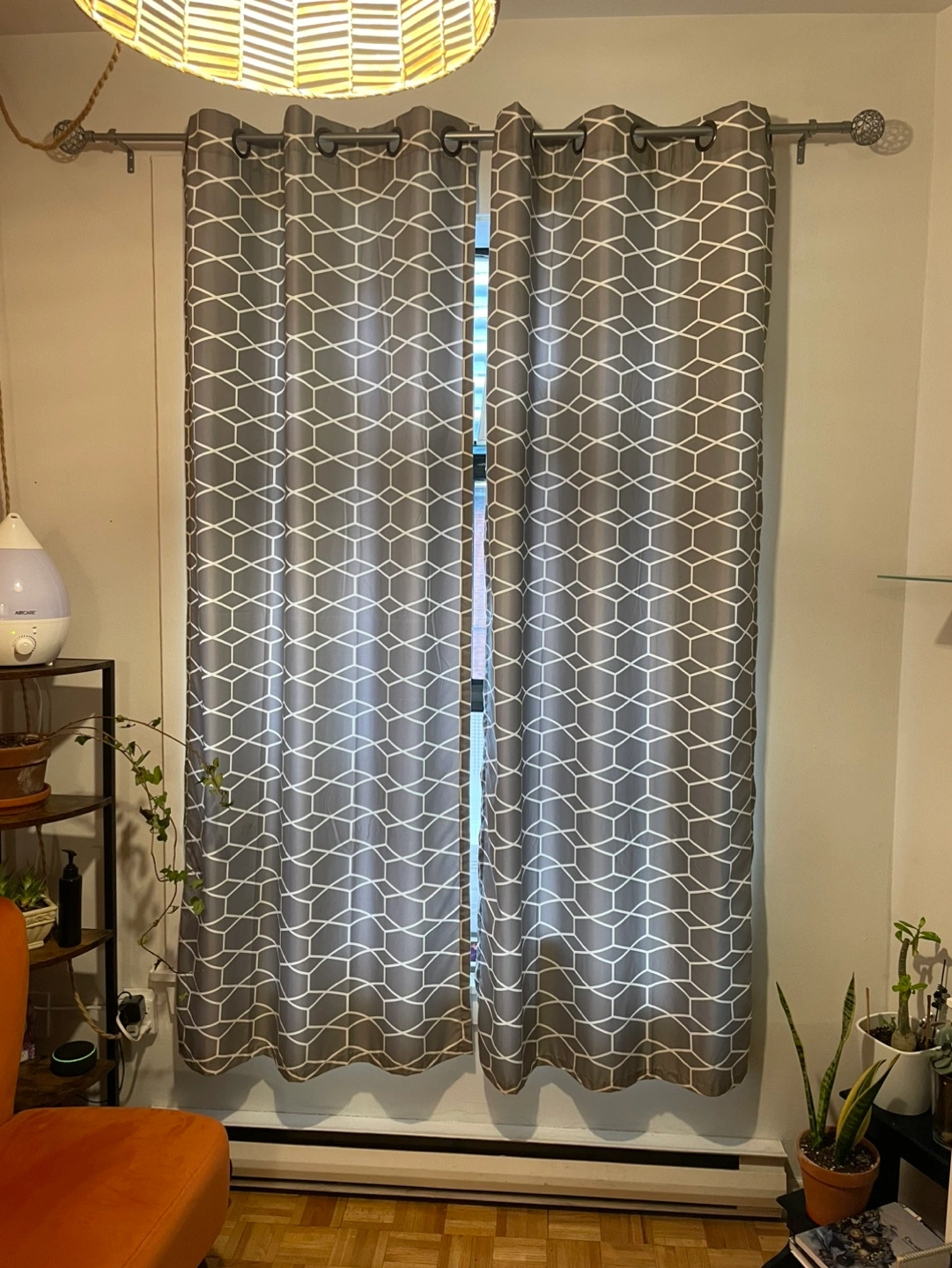 Pair of grey curtains, geometric pattern, grommet top. Good condition. Light filtering. Grey & white.