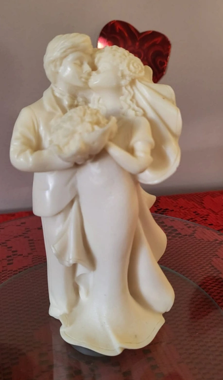 This vintage cake topper is made from some sort of composite material that gives an alabaster look.