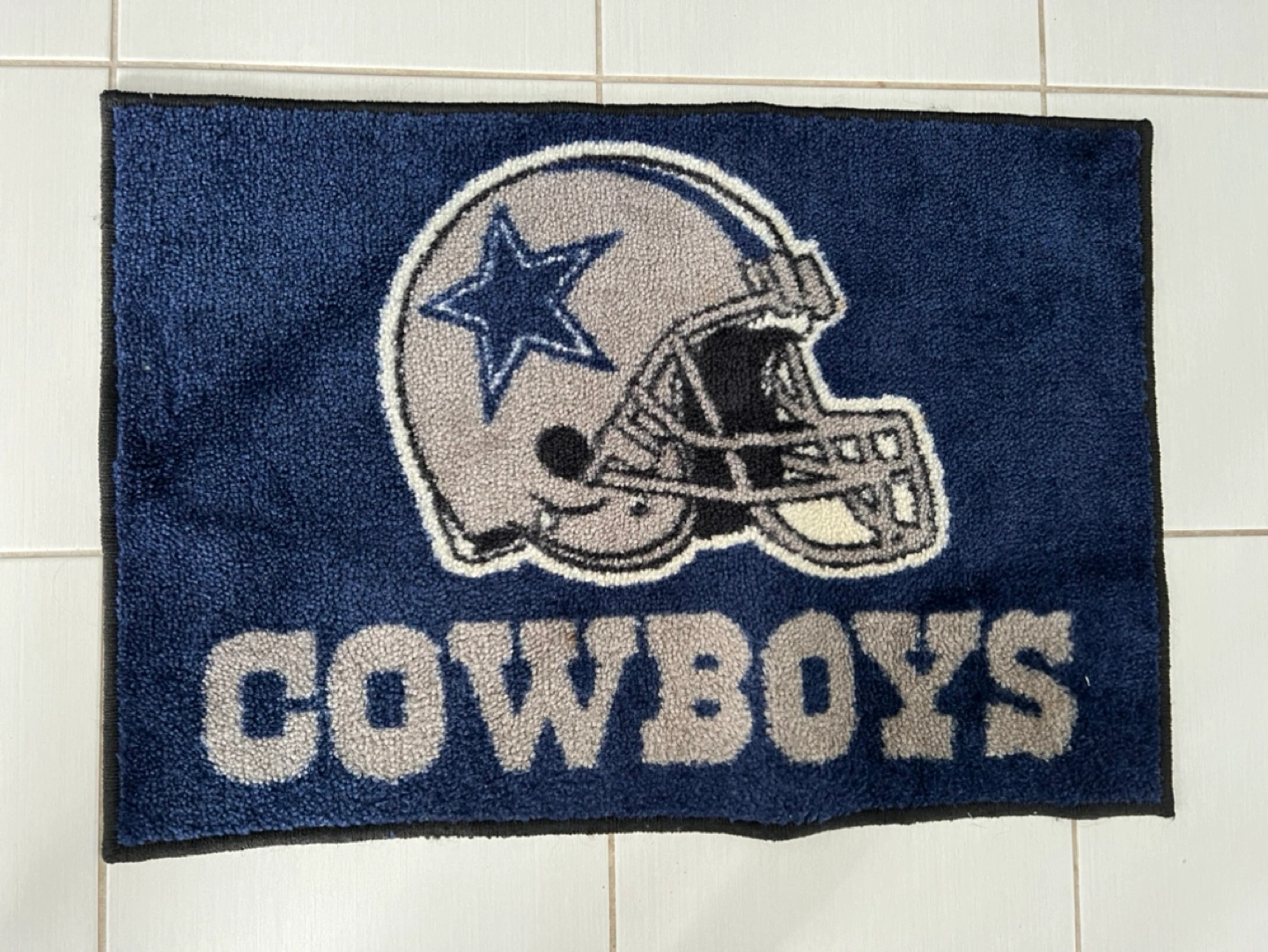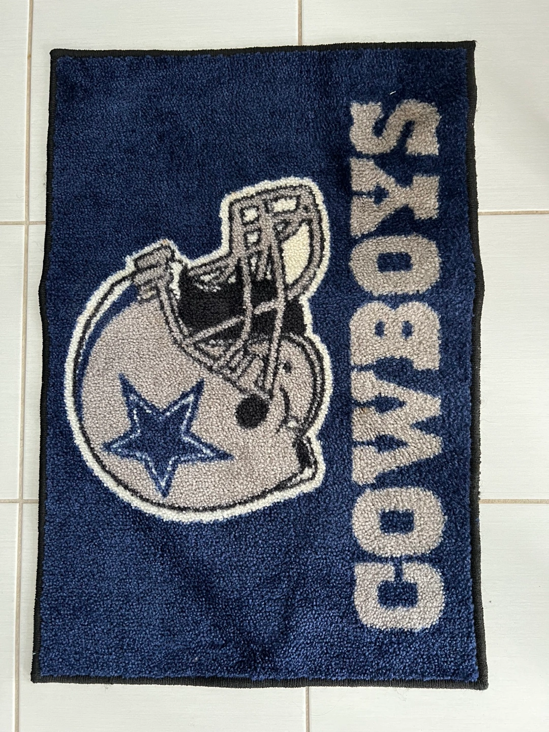 Small, rectangular rug. Features Cowboys logo and helmet. Blue colour scheme. Approximately 2 feet