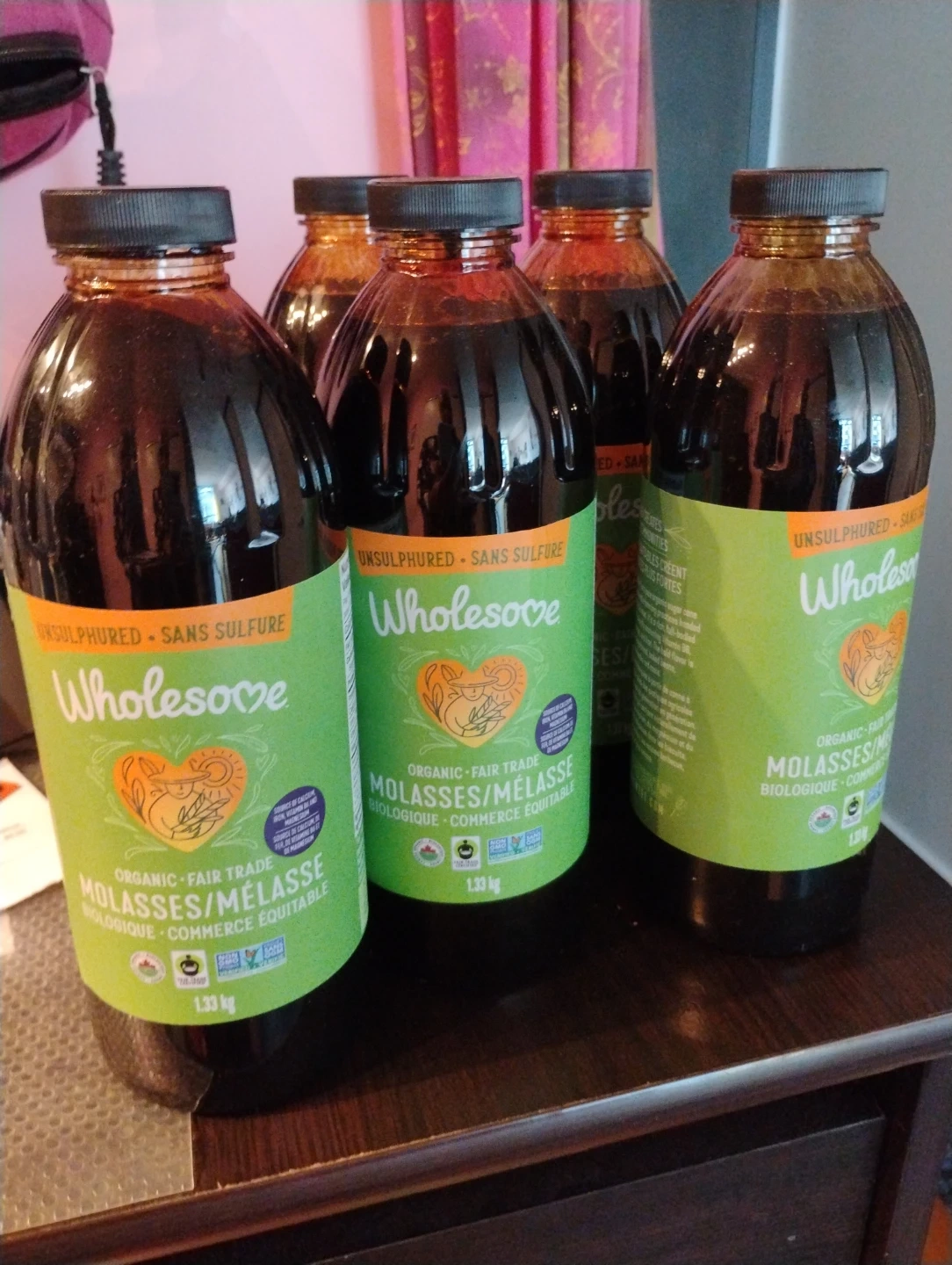 Sealed 5 bottles of Wholesove Organic Fair Trade Molasses, unsulphured. Each bottle is 1.33 kg. It's organic and fair trade certified. Great for baking and cooking! Exp Sept 2027