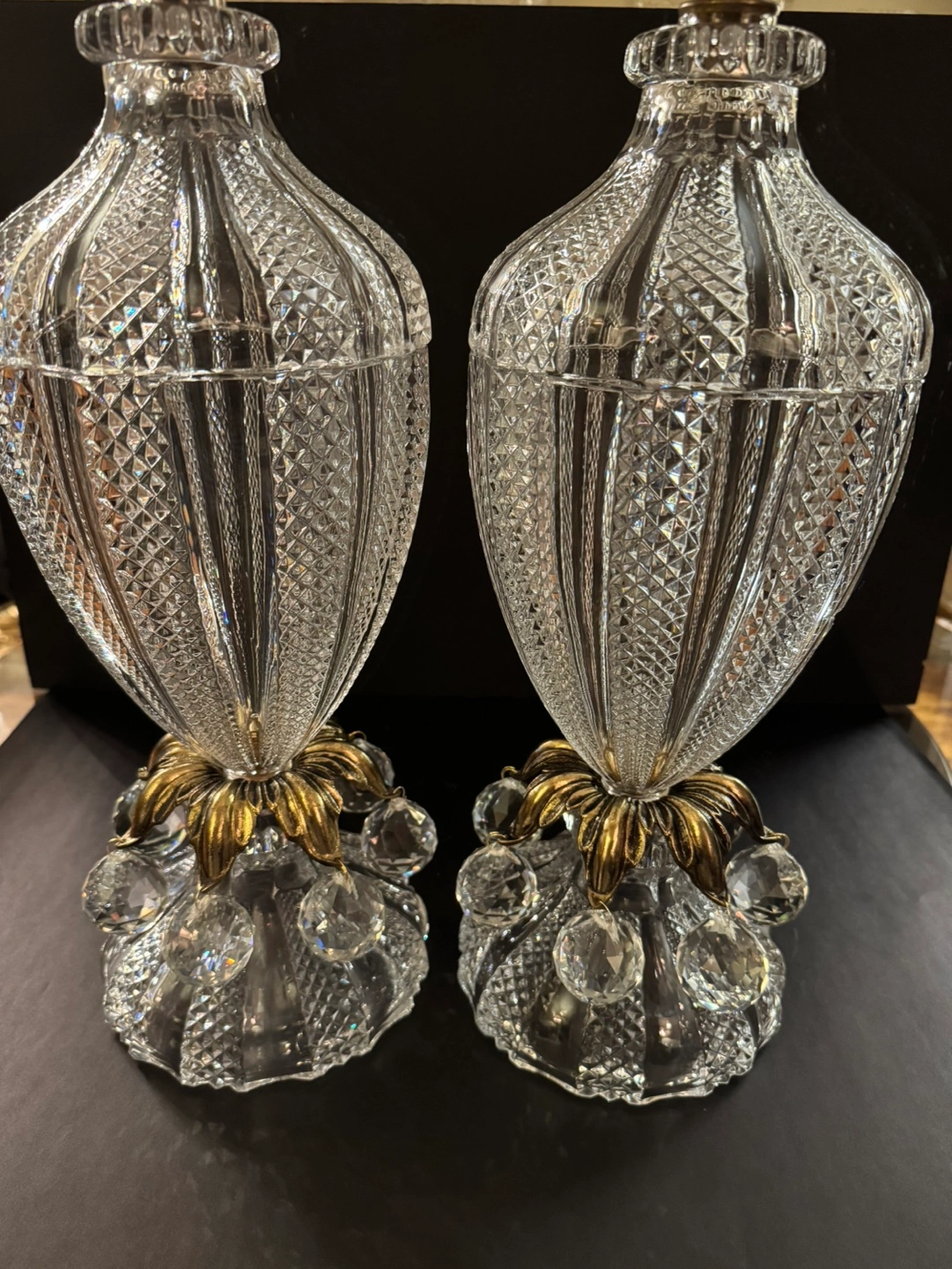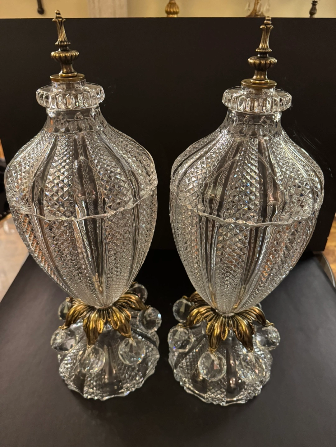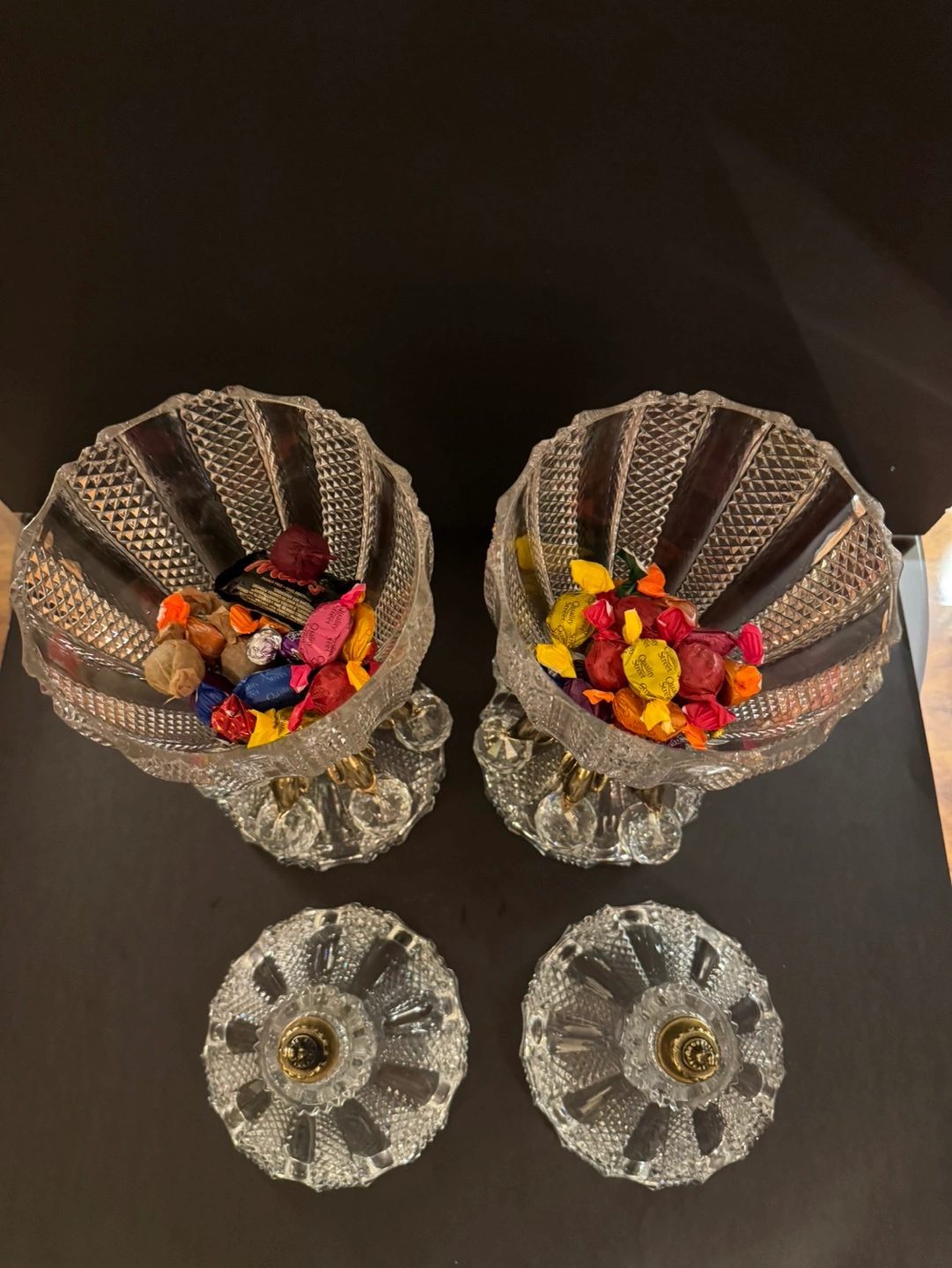 Elegant pair of crystal Candy Bowls Features a faceted crystal body, brass accents, and dangling crystal prisms. Includes two removable lids.High 20 inch Diameter 7 inch