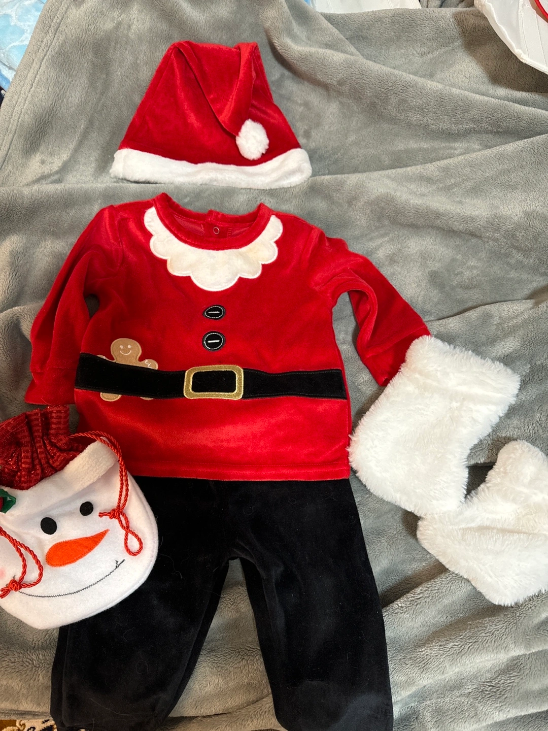 Infant Christmas outfit. Red velvet Santa suit, black pants, white booties, and Santa hat. Includes a snowman drawstring bag. Perfect for holiday photos! Worn once.