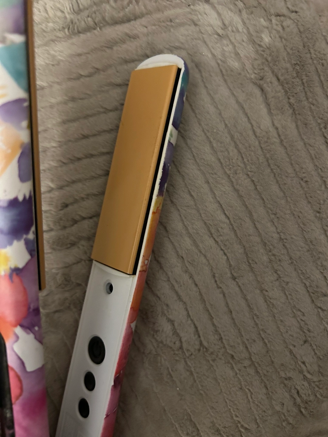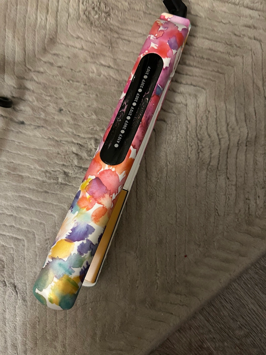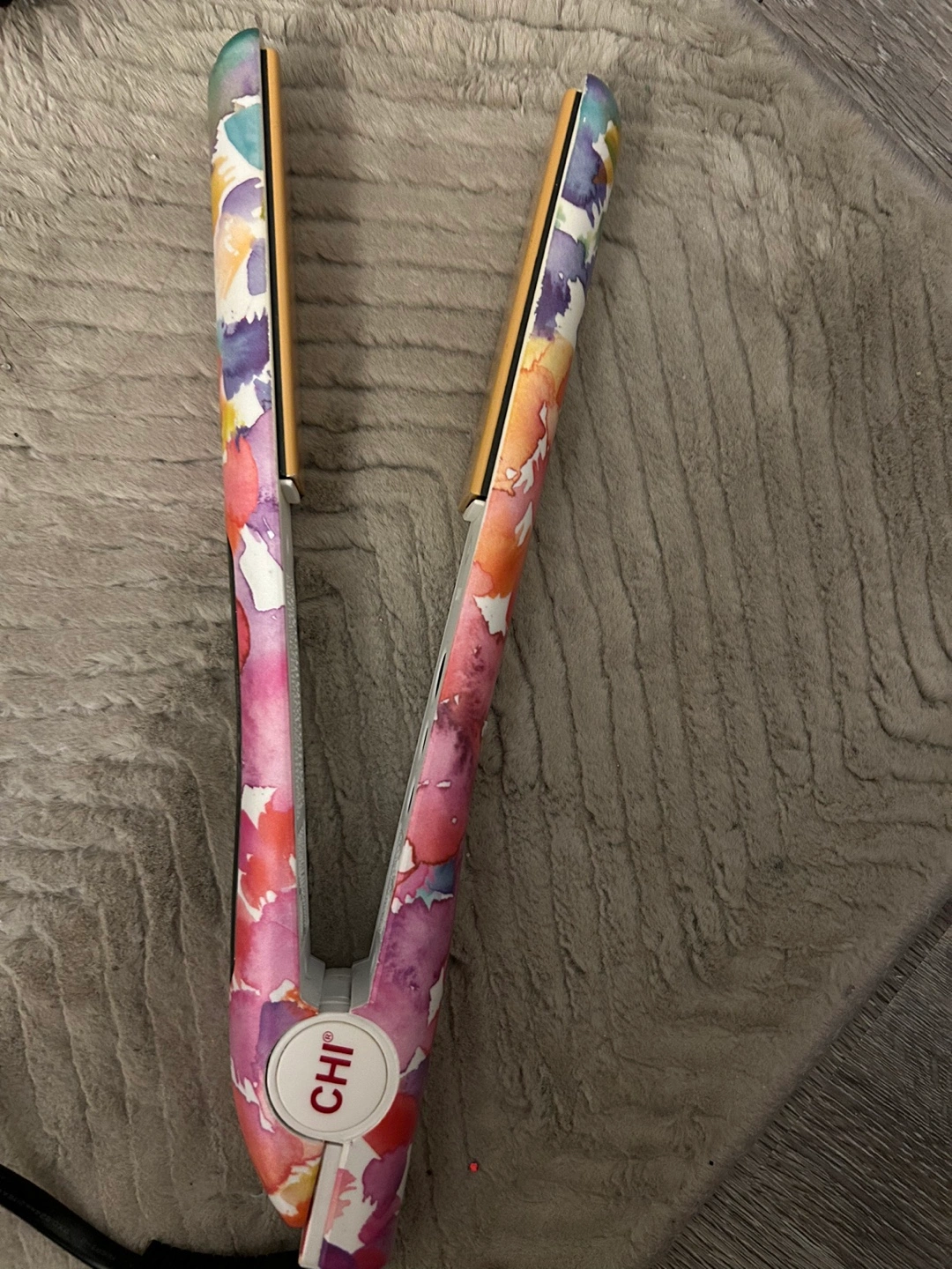 Used CHI G2 flat iron. Watercolor design. Features adjustable temperature settings. Plates appear to be in good condition. Includes cord.