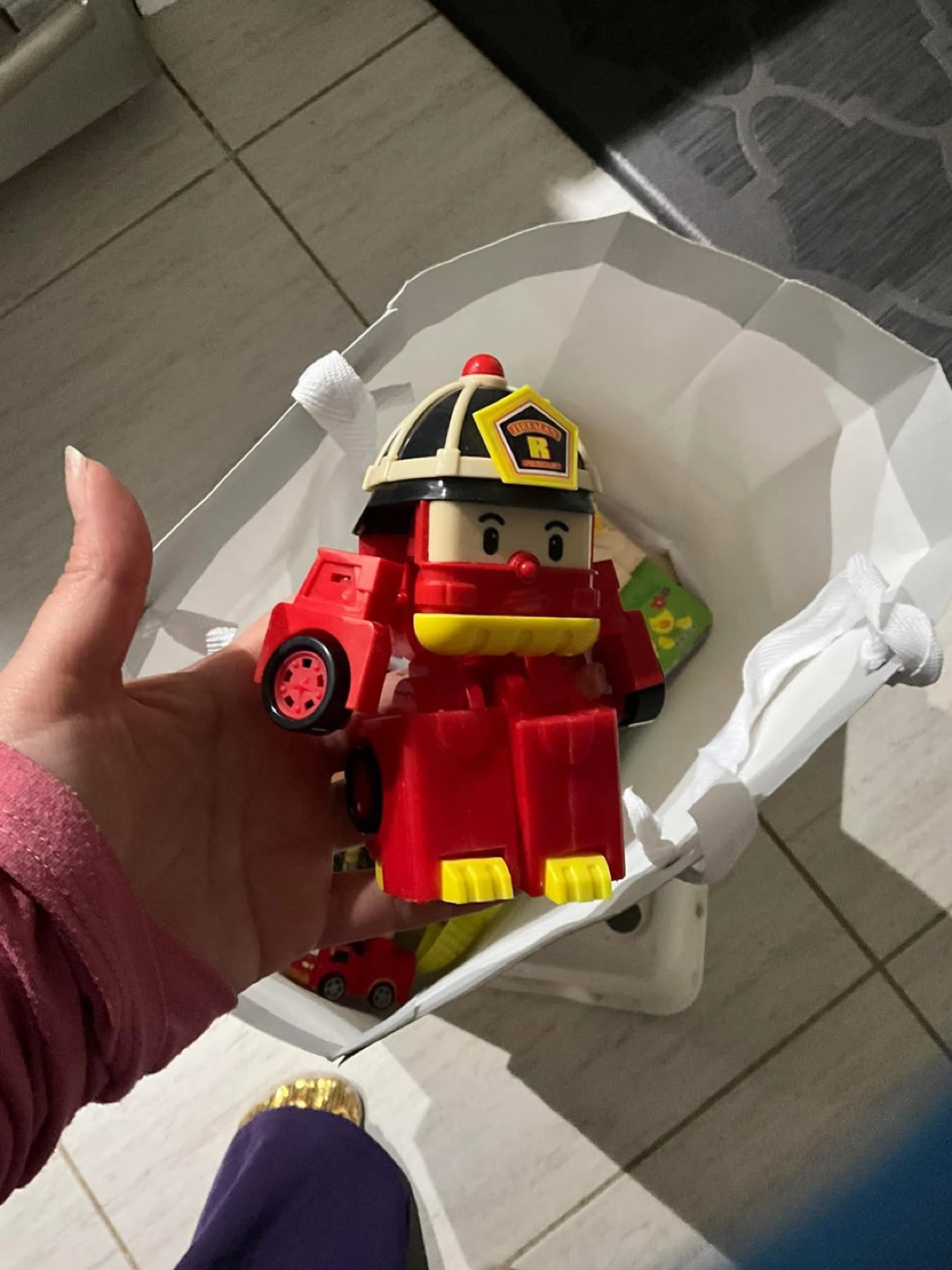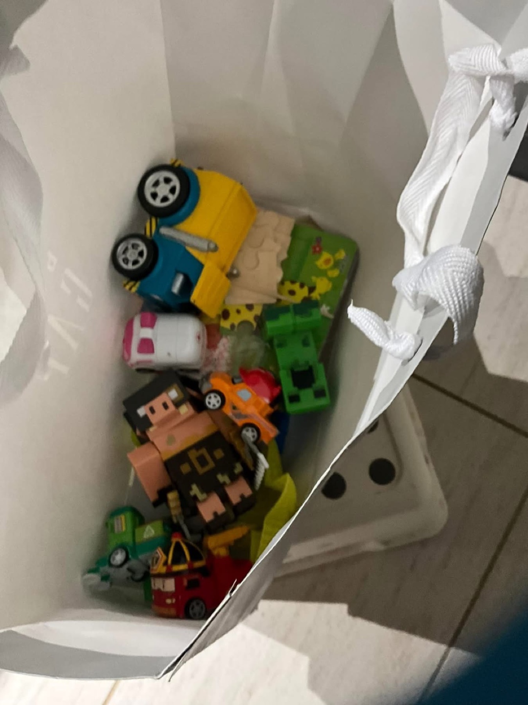 Bag of assorted children's toys, including vehicles, figurines, and a learning book. Some toys appear to be Minecraft themed. Also includes puzzle blocks with animal designs.