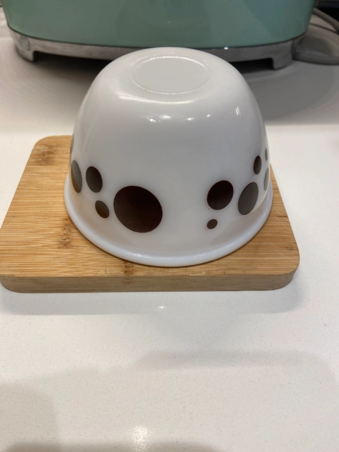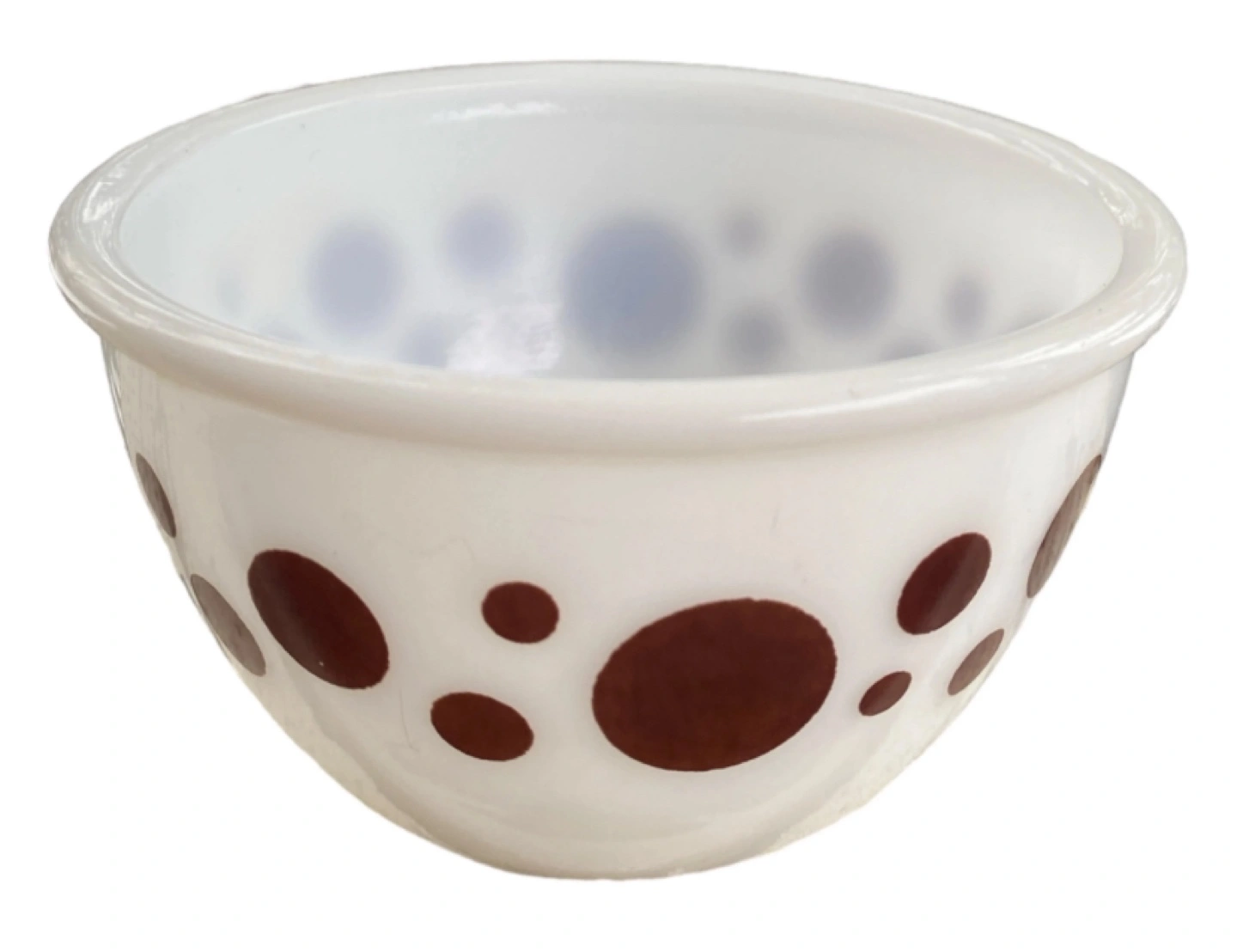 Vintage from the 1950’s and absolutely perfect! Small vintage milk glass bowl. Features a brown polka dot pattern.