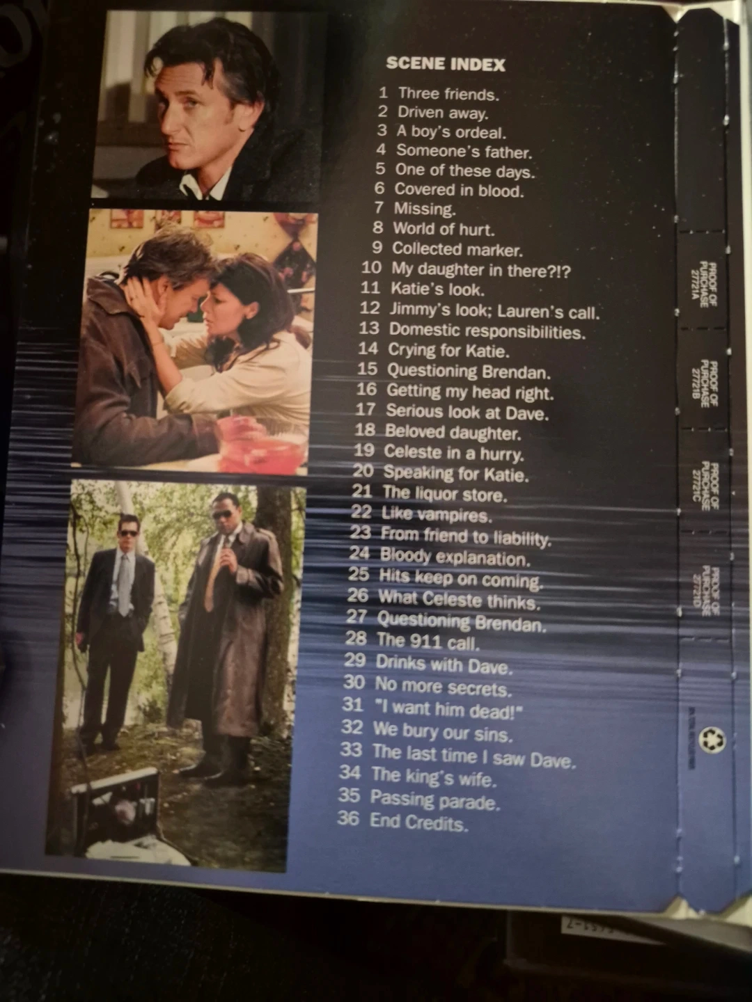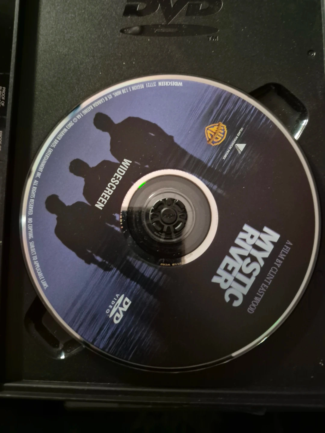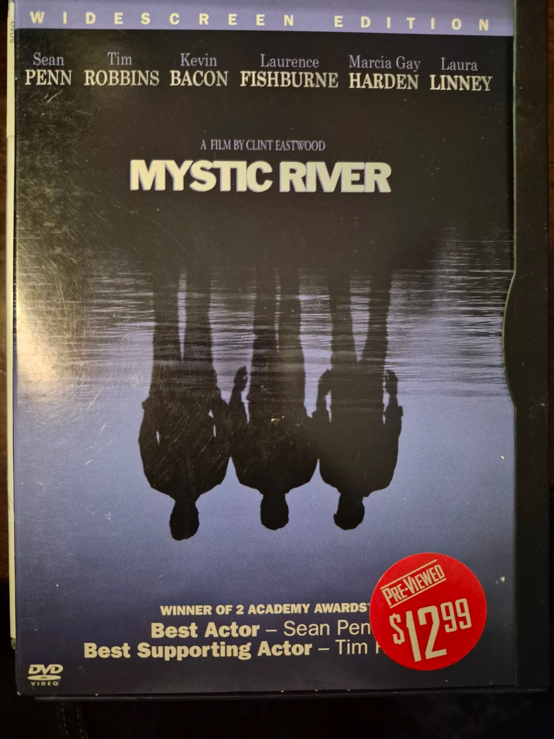 Selling a used DVD of Mystic River, a film by Clint Eastwood. This is the widescreen edition. The cover shows Sean Penn, Tim Robbins, Kevin Bacon, Laurence Fishburne, Marcia Gay Harden, and Laura Linney. The DVD includes a scene index on the back cover. It was originally priced at $12.99.