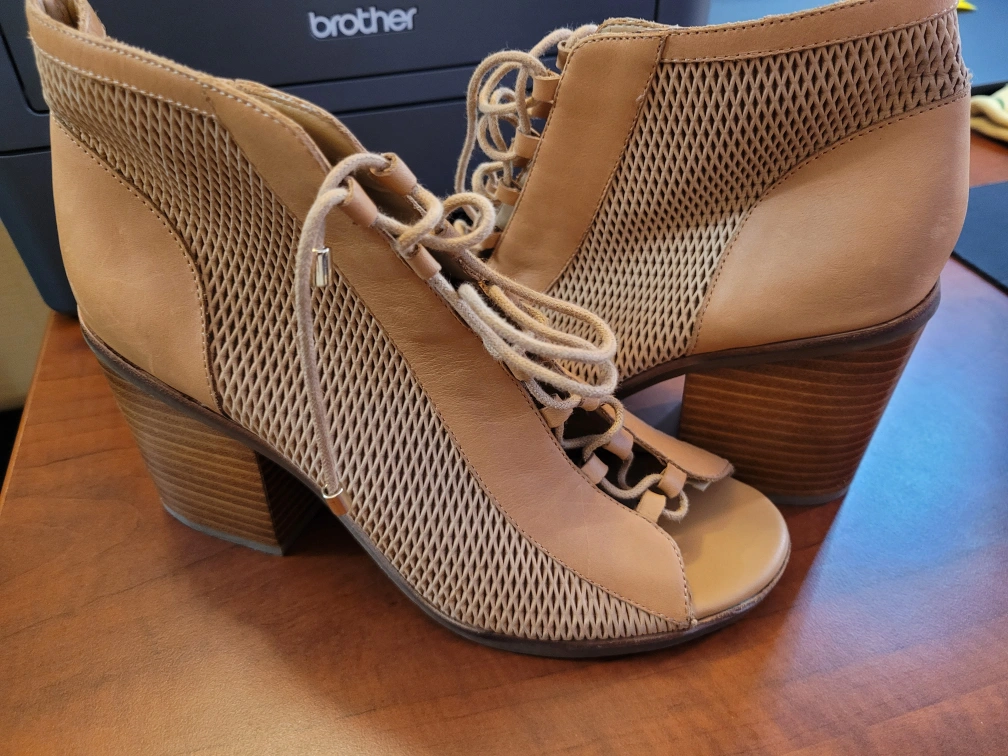 Pair of ALDO women's booties. Genuine leather with woven detailing. Open toe and lace-up design. Block heel. Size US 8.5, EUR 39, UK 6.