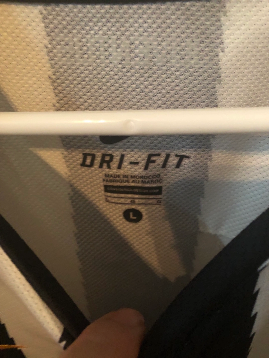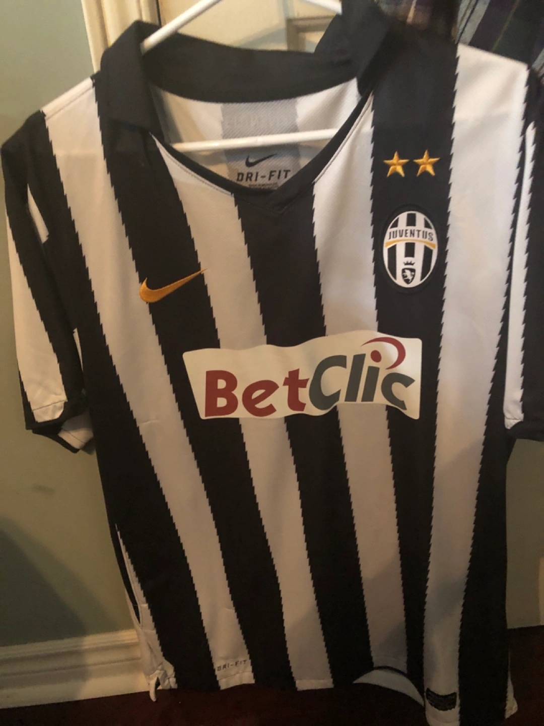 Men's Juventus soccer jersey. Black and white stripes. BetClic sponsor logo. Nike Dri-FIT technology. Size large. Made in Morocco. Mccowan and 16th porch pickup cash only taking the listing down if not sold today