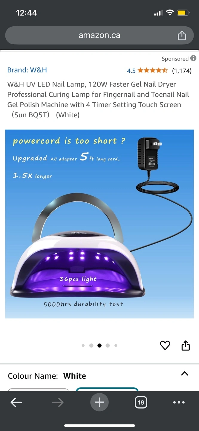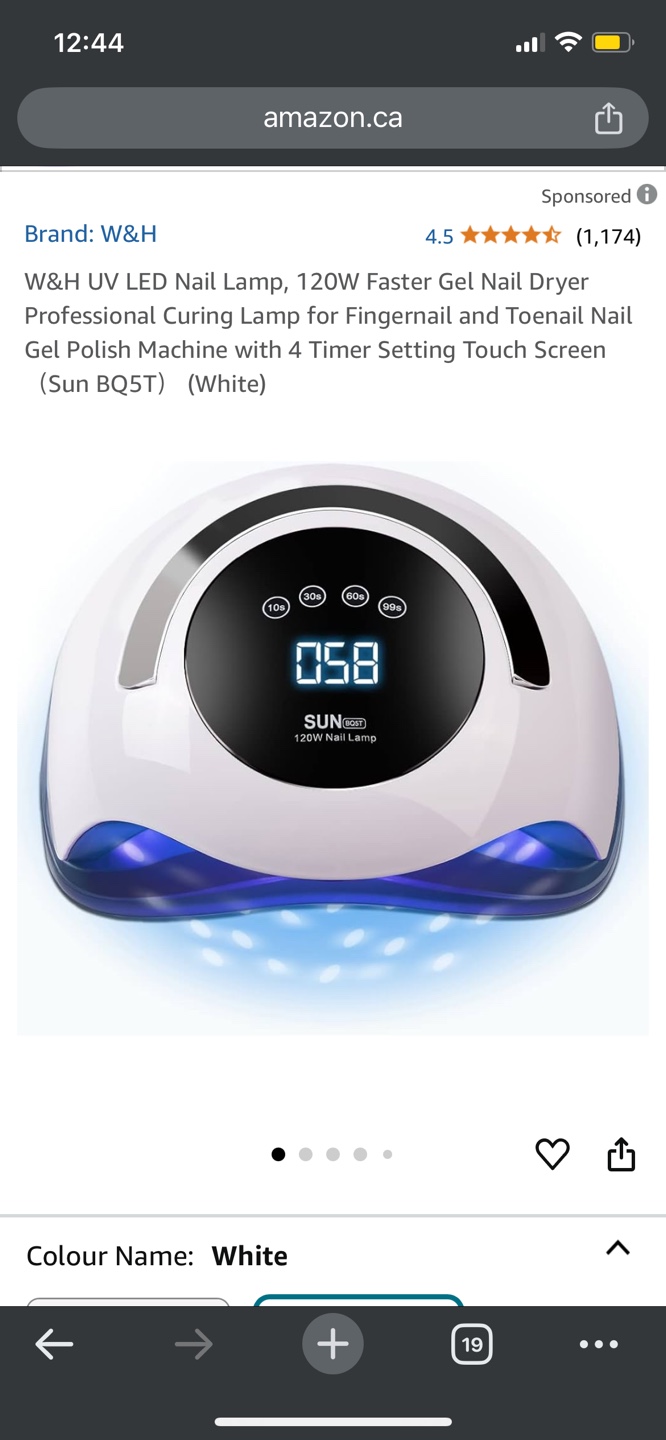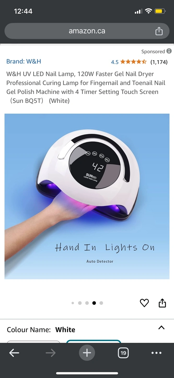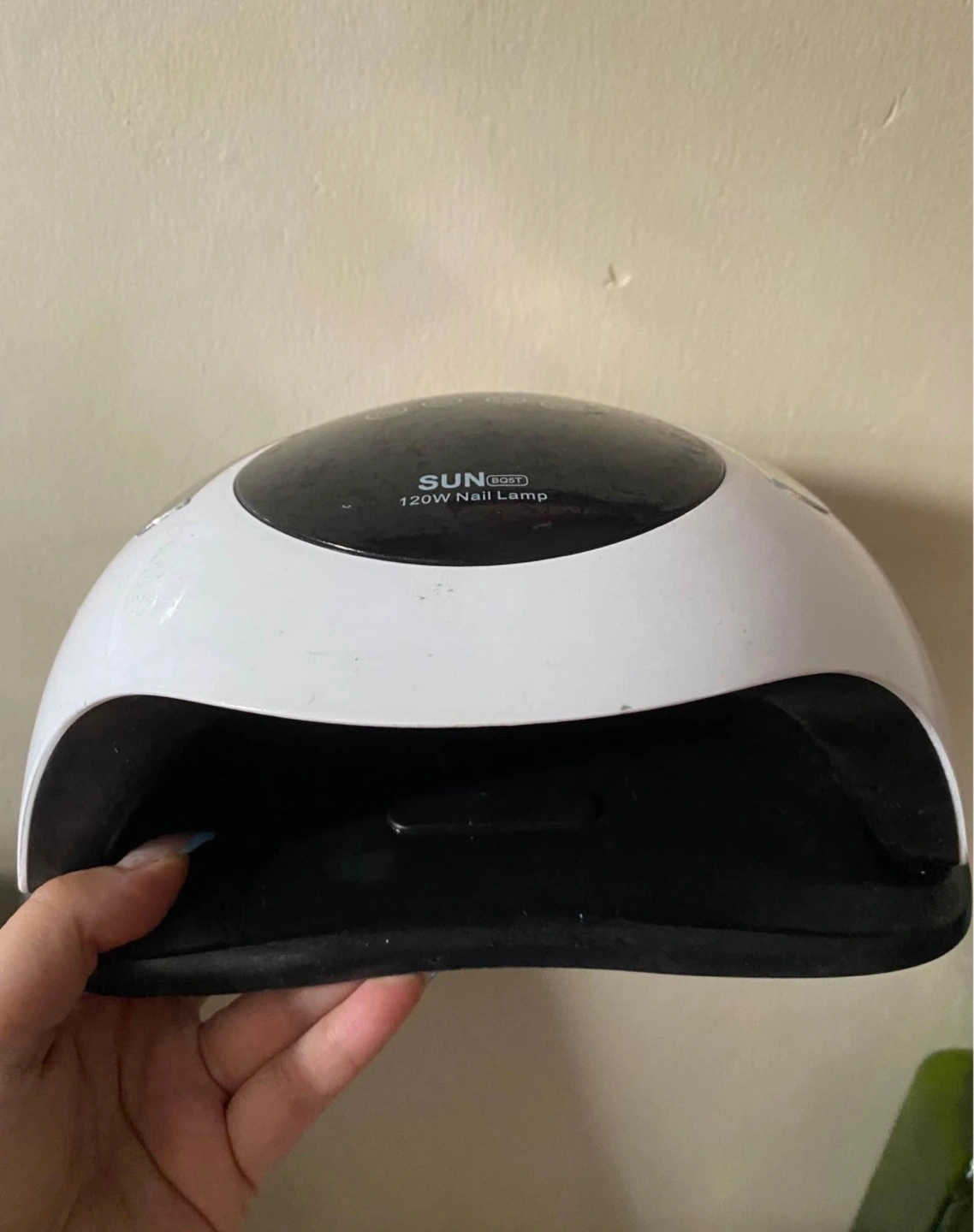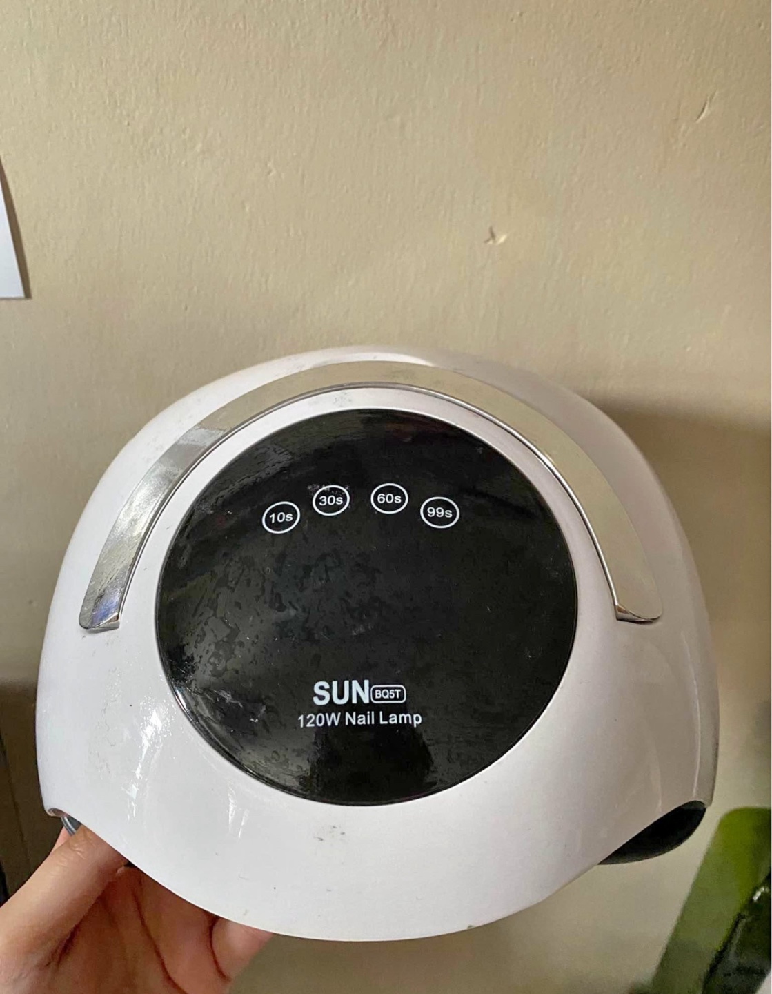 White 120W nail lamp. Four timer settings. Professional curing lamp for fingernail and toenail gel polish. Touch screen operation. Used condition.