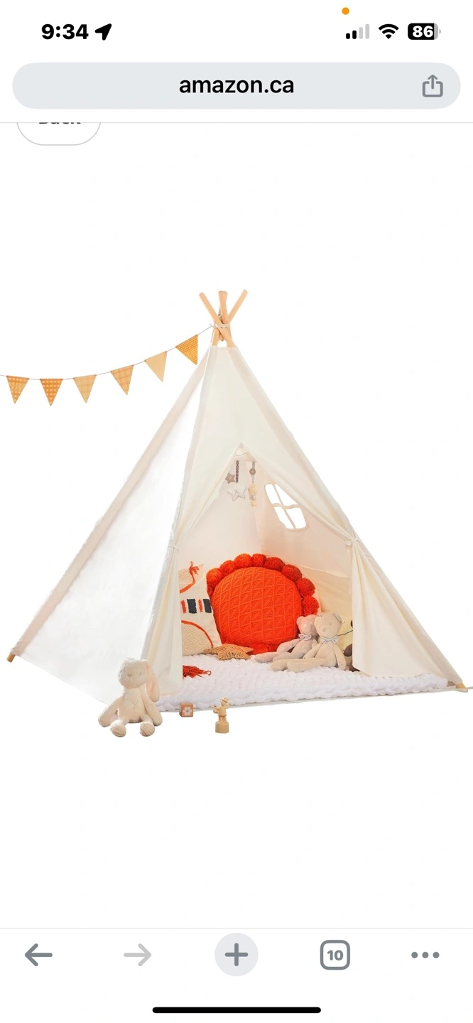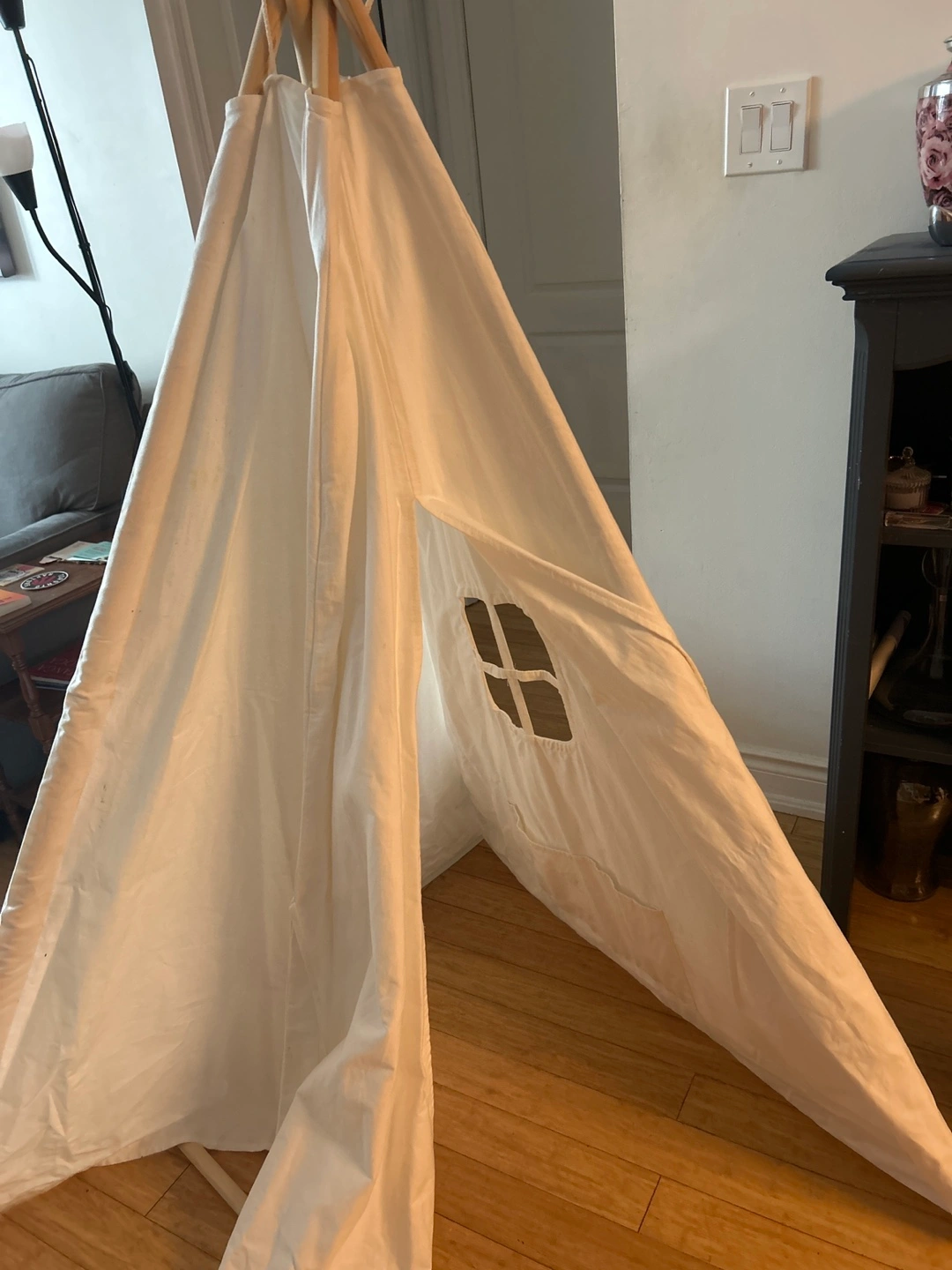 375Cream-coloured children's play tent. Wooden poles that come apart One pole missing, can get at hardware store.
