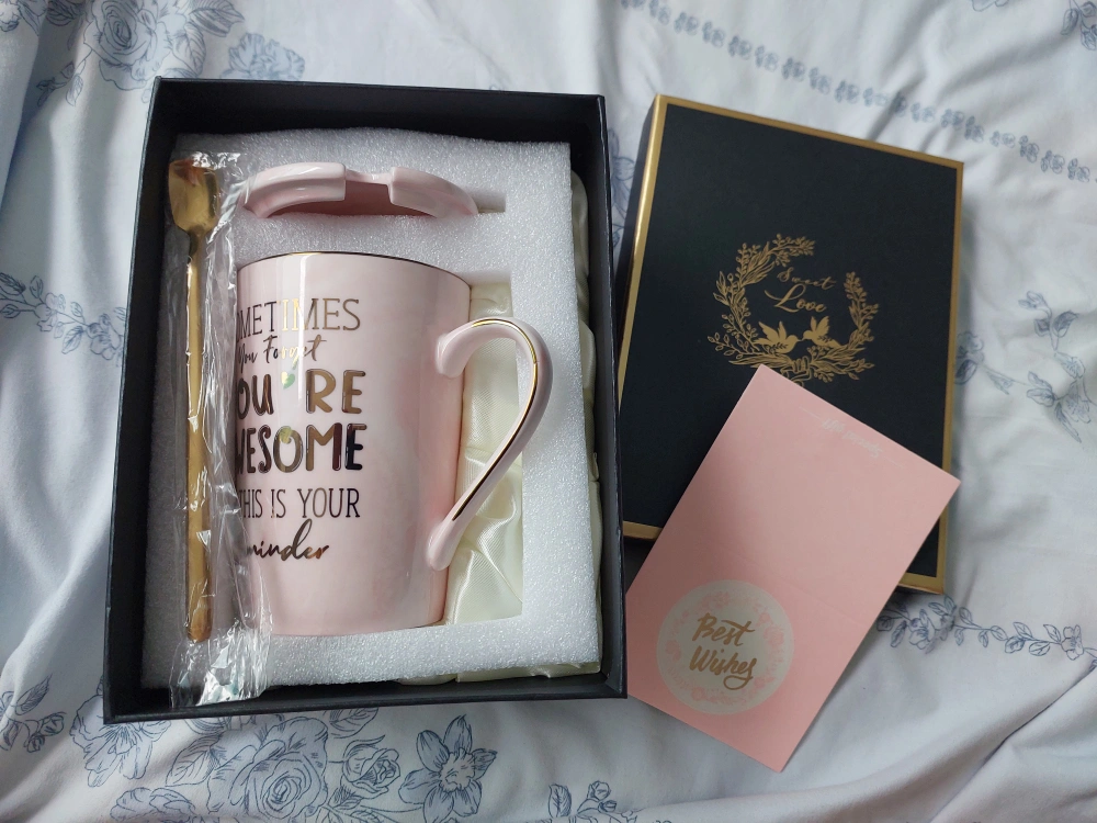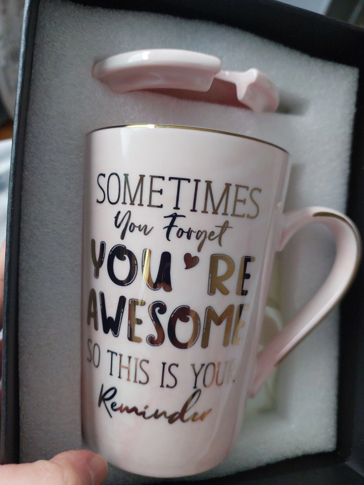 New pink ceramic mug. Features gold lettering and a lid. Comes with a matching gold spoon. Packaged in a black gift box with gold accents. Perfect gift!