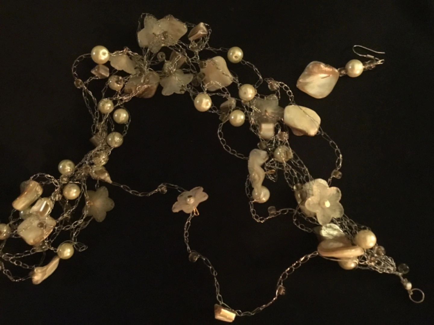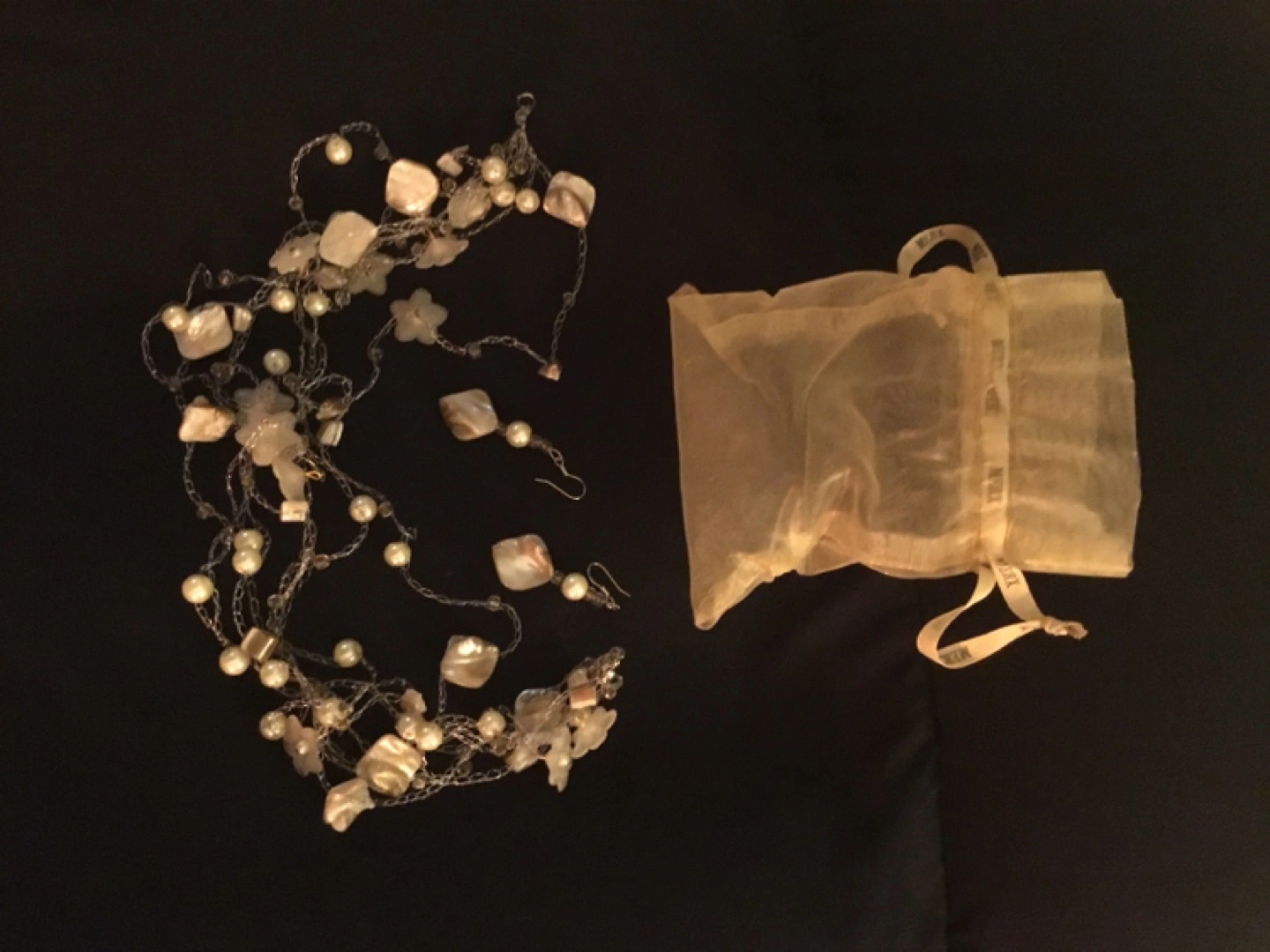 Close to neck necklace and earnings, very nice for marriage and fancy parties! They were given as Christmas gift but I do not wear these earrings because my ears are not with a hole. So enjoy. I want to buy a chocolate bar instead! About 47cm